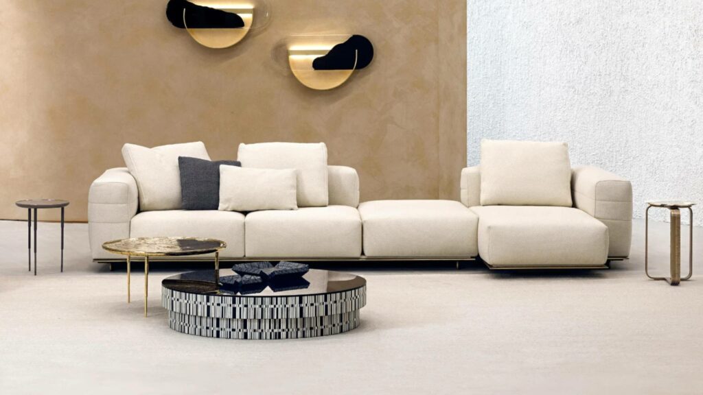 An angular, rectangular coffee table is ideal for arranging with a long sofa, while round tables soften spaces with more seating.