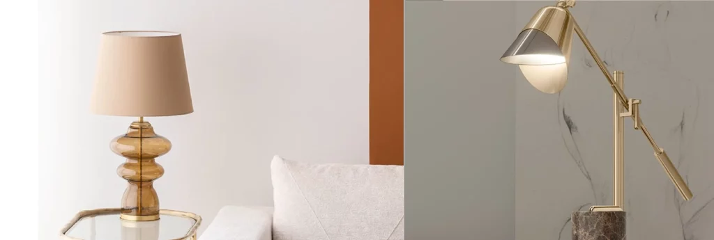 Metal, ceramic, or wood bases offer different looks and textures, while fabric, paper, or glass shades can affect the quality and diffusion of light