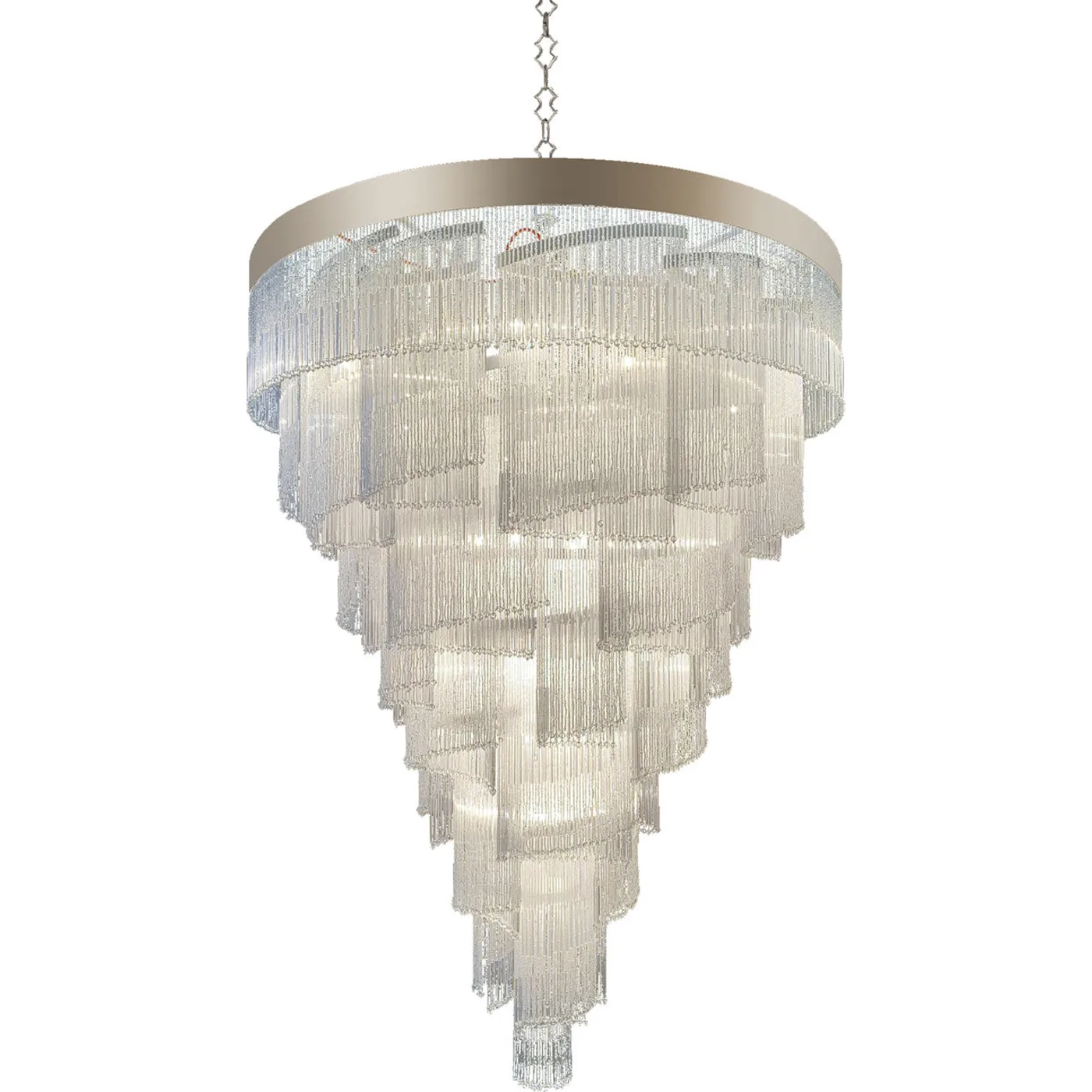 Crafted in the time-honored Venetian glassmaking tradition spanning centuries, this grand pendant lamp from the Venezia Collection epitomizes excellence in design and craftsmanship. The meticulously fashioned design showcases numerous glistening crystal rods cascading in an intricate, swirling, multi-layered pattern, embraced by a brushed gray steel ring. This captivating chandelier promises to imbue any space with an enchanting ambiance. It requires forty G9 energy savers or G9 LEDs for illumination. Additionally, it is available in amber crystal and can be finished in brushed burnished, champagne, or polished 24K gold upon request.