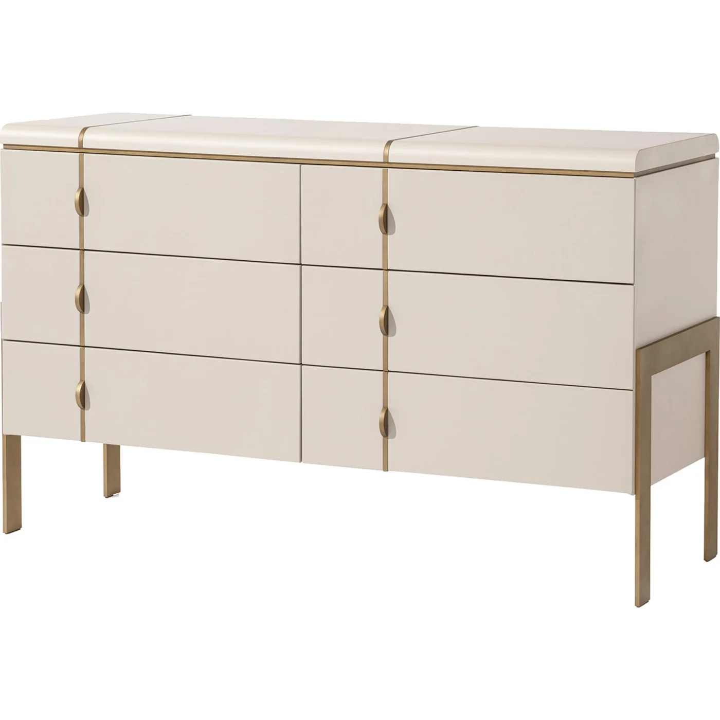 Completing the ensemble alongside the Althea Nightstand and Vanity Table, this magnificent dresser adds a distinctive touch to a luxurious contemporary bedroom. Adorned with metal inserts and finished in white lacquer, the dresser features six drawers and stands gracefully on sleek flat-bar metal legs. For personalized adjustments and additional options, please reach out to the Concierge.