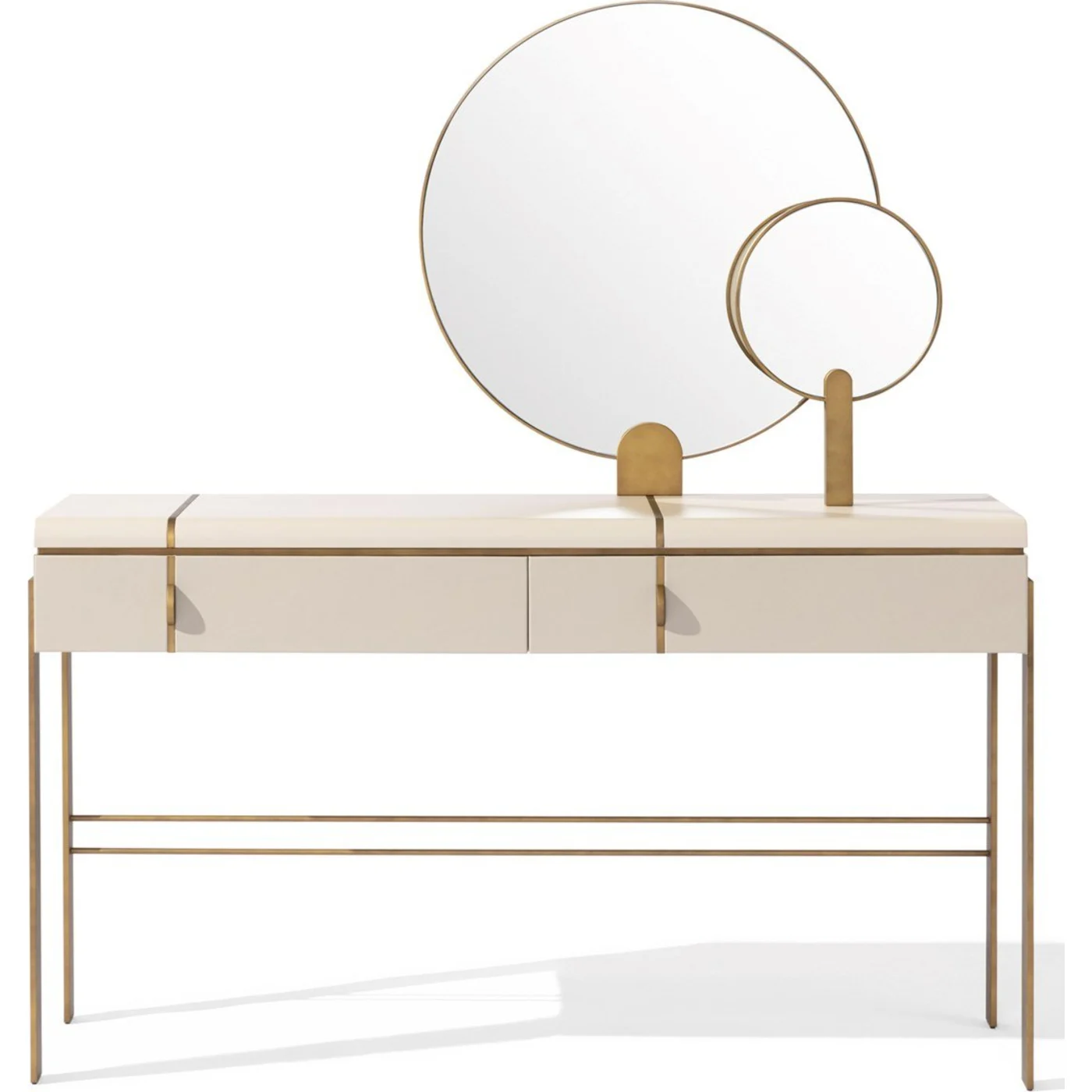 This magnificent vanity table has a clean, straightforward style that is defined by refined minor features. It has two drawers, a metal base comprised of thin and slender legs, and two wonderful mirrors of contrasting sizes fixed on bronzed metal frames. It is adaptable and ideal for premium contemporary settings; please ask the Concierge for possibilities.