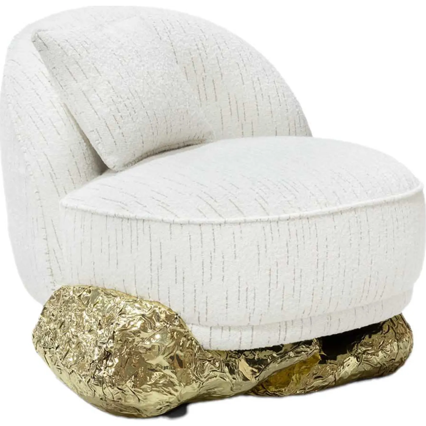 The Angra armchair is based on the Angra sideboard, a stylish sample of comfort and art. The contemporary armchair is inspired by the awe-inspiring cliffs of Angra do Heroismo on the Portuguese island of Azores and is perched on a uniquely formed golden base. As you sink back into the comfortable cushions of this chair, you voyage through design and nature’s beauty. This singular piece is ready to enhance your room and bring refinement while referencing contemporary beauty and ancient landscapes.