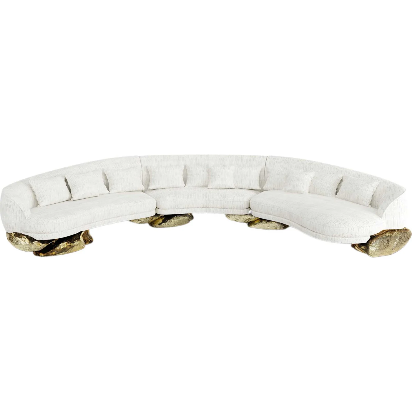We are excited to present the Angra Curved Sofa, inspired by the stunning Angra Sideboard, and as beautiful as it is comfortable. The design of this unique sofa draws its influence from the incredible cliffs of Angra do Heroísmo from the Azores Islands, in Portugal. It rests elegantly atop an original and curved gold base. Sitting and relaxing in this true work of art is not only relaxing; it symbolizes that the sofa will immerse you in a story that pays homage to artistic talent and cultural settings. Meticulous design enhances your living space to one of sophistication and inspiration, encouraging you to dream of design past the obvious.