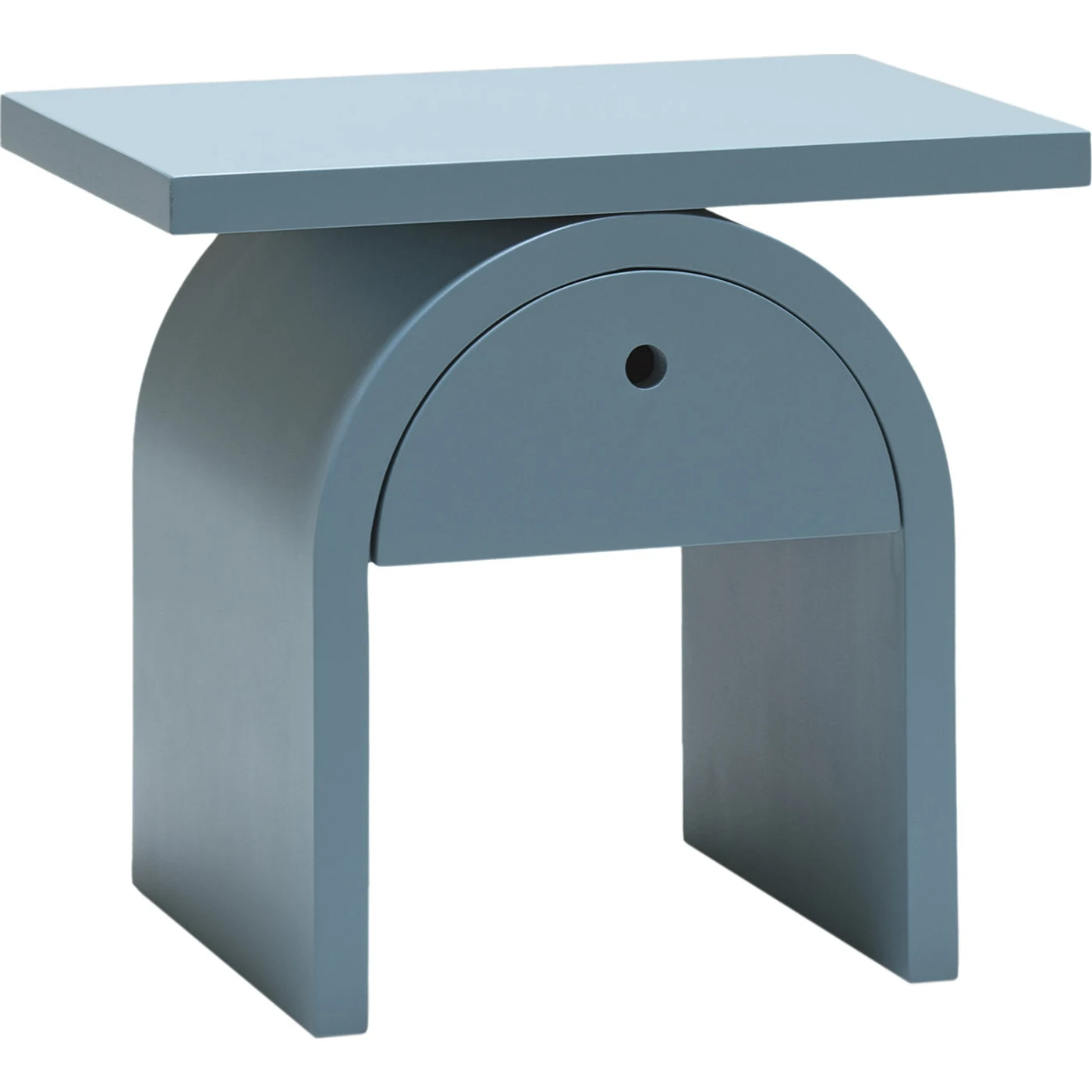 Crafted from light blue lacquered MDF, this artistic nightstand captures the charm of a modern sculpture, while also serving as a useful place to keep a clock, table lamp, and other necessities at night. A drop-leaf door closes the small storage unit, which is placed inside an arched structure that supports the rectangular top in a precarious balance. Please inquire with the concierge about additional color options.
