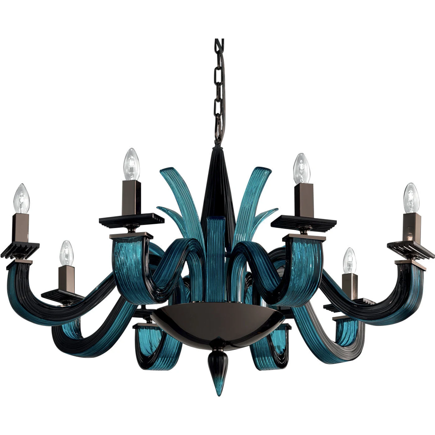 Designed by Studio in Project, this stunning chandelier is distinguished by intricate detailing and a bold silhouette. It features eight rectangular ridged glass arms in aquamarine, complemented by lateral black panels that elegantly curve and taper into a black glass cup. Similar rectangular elements adorn the central body, echoing the ridging on the arms. Black rectangular plates support the square metallic light bulb holders, enhancing the aesthetic harmony of the piece. All glass elements are adorned with an innovative double coloring technique, adding to its visual appeal and sophistication.