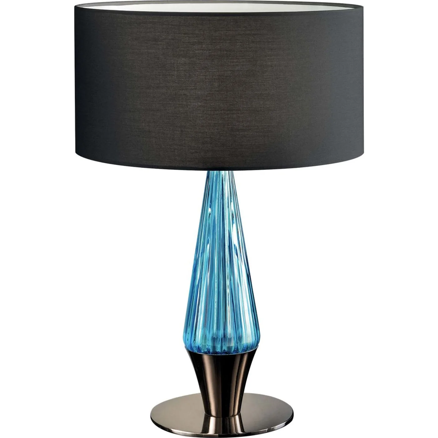 This lamp features an innovative conical shaft with a rectangular section and a short cylindrical lampshade in gray polycotton fabric and PVC. Highlighted by aquamarine details, it adds a refreshing touch to its design. Customization with other finishes is also available upon request, allowing for personalized adaptations to suit various preferences.