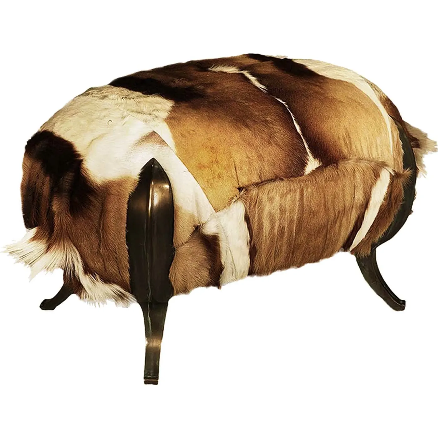 Antelope fur upholstery will enhance any modern or rustic space, and this gorgeous pouf designed by Carlo Rampazzi, is the ideal accent piece. The textured and sophisticated cover is a unique decorative cover in light brown and white that enhances the appearance of a study or living area and creates a beautiful piece of useful décor. The four bronze curved legs give the sculpture a distinctive look by adding a contrastingly smooth surface.