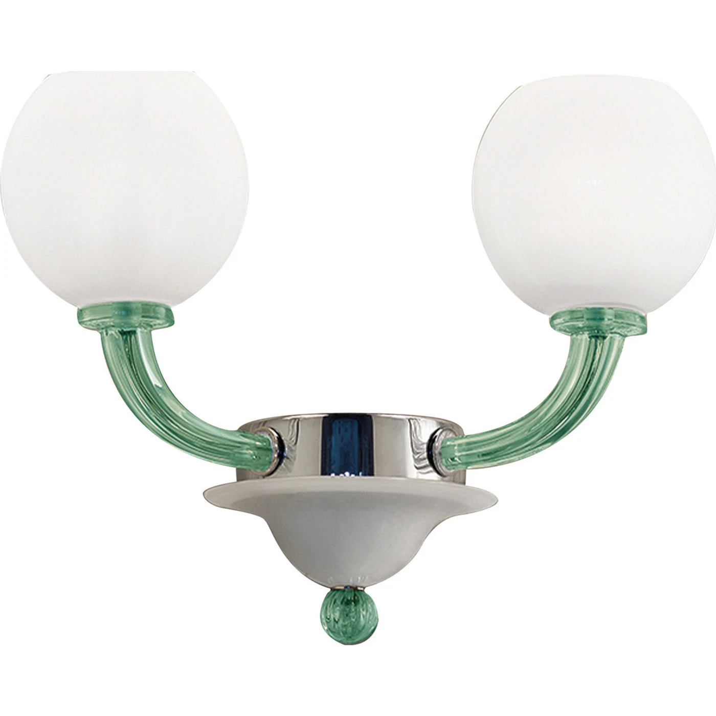 This exclusive sconce from the Gritti Collection combines glamorous textures and colors in a contemporary design of striking visual impact. It features two arms crafted from rigadin blown glass in a vibrant bright green hue. The chrome metal structure adds a complementary brightness to the white incamiciato geometric wall mount, which is also used for the globe diffusers. Ideal for enhancing long hallways, foyers, or lounge areas in residential and hospitality interiors, this sconce is available with a gold finish upon request. It requires two E14 max 42W bulbs for illumination.