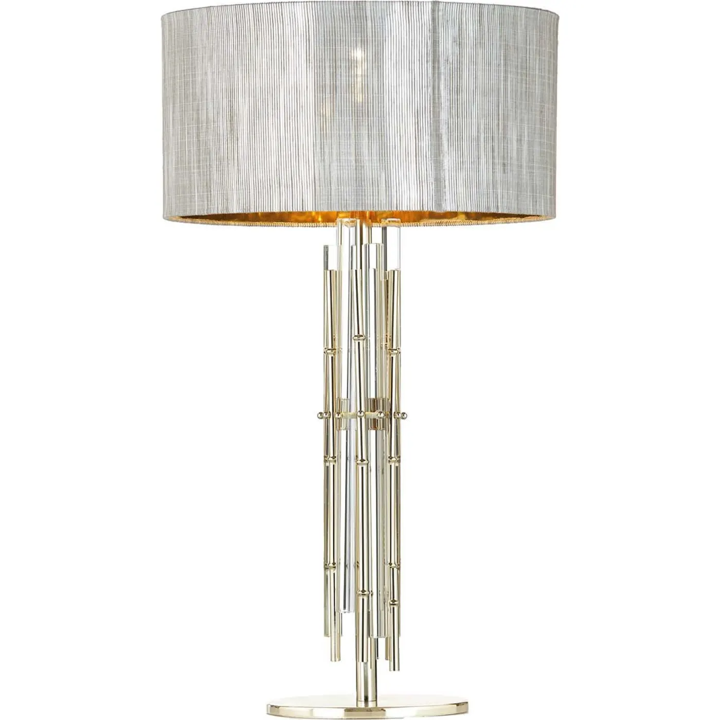 Enhancing contemporary interiors with a glamorous touch, this table lamp features a polished metal frame and a silver fabric drum shade. The defining element is the slender stem, supported by a circular base and embraced by bamboo-shaped brass elements encased in clear Murano glass, providing texture and a glittering shine. The PVC-lined shade diffuses ambient light from a single E27 LED bulb.