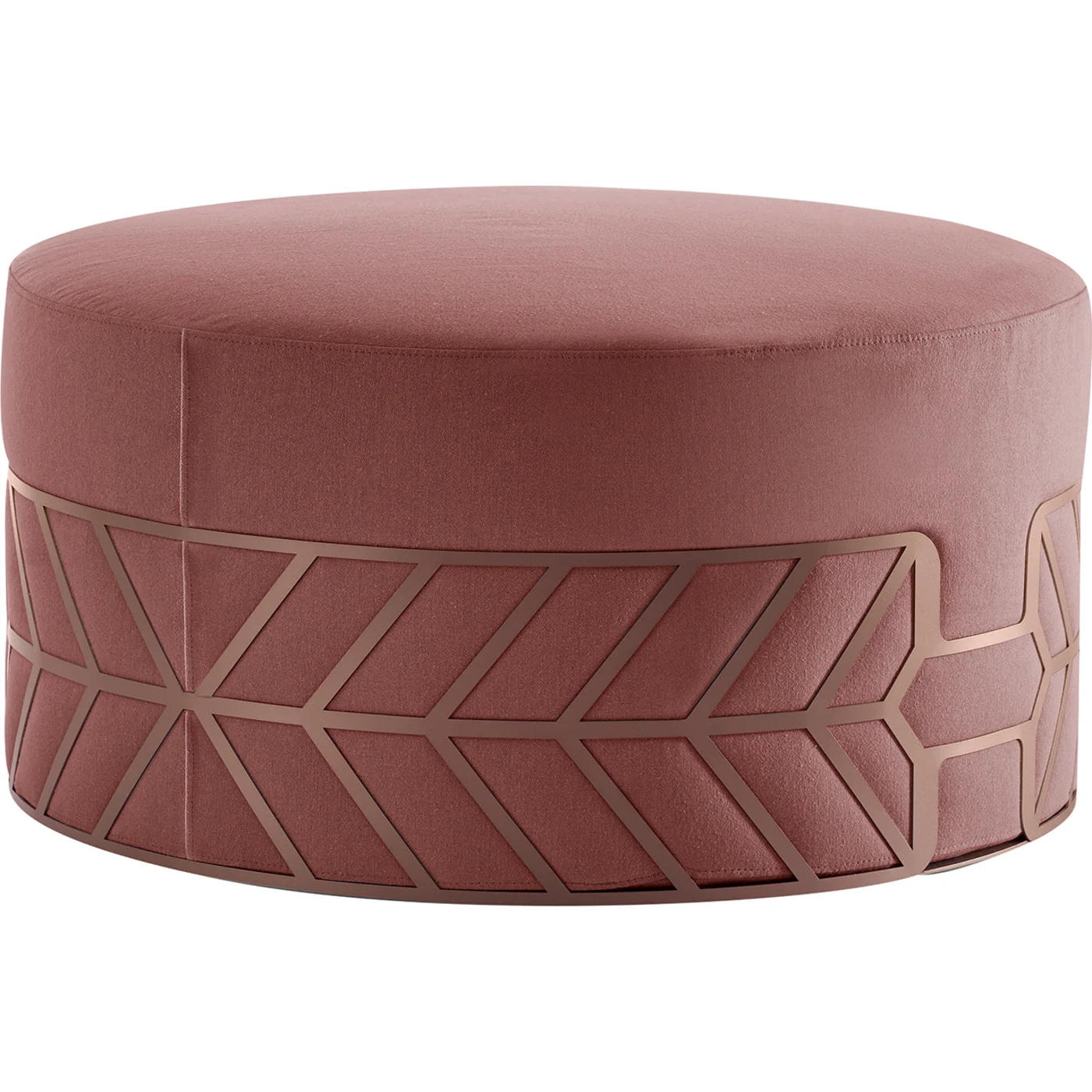 A design by Elena Salmistraro this circular pouf is charming and sophisticated, and looks stunning in a modern setting. It is characterized by a belt-like ring-shaped structure composed of satin amber-finished steel that encloses a plush cushion composed of polyester fiber and polyurethane foam. It is upholstered in a peach-colored fabric that exudes classic refinement.