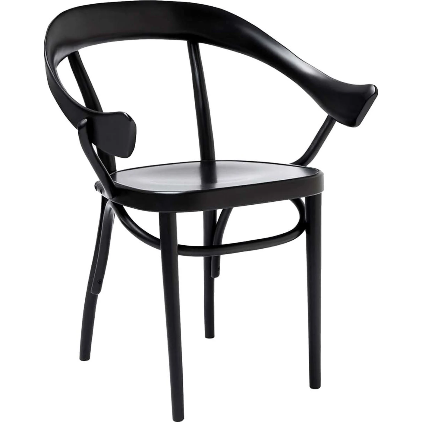 Designed by Nigel Coates in 2016, this exquisite and versatile armchair offers a blend of comfort and sophistication, reminiscent of traditional Thonet pieces. It is designed to be mixed and matched with other creations by the British designer around a contemporary table. The chair's ergonomic lines evoke an anthropomorphic sculpture, with a curved backrest that extends gracefully into shoulderblade-like armrests. Crafted from steamed-bent beechwood, a hallmark of Thonet's furniture, the chair showcases refined proportions and timeless elegance.