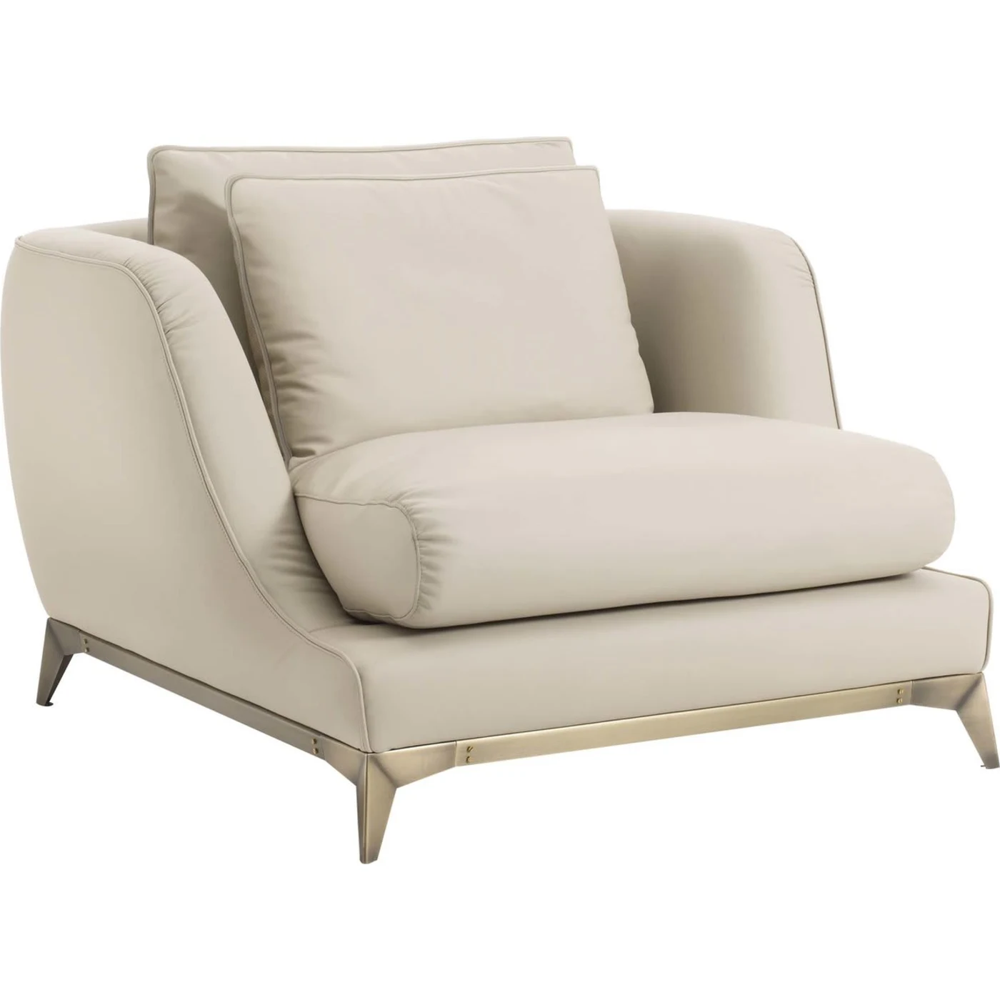 Radiating comfort and elegance, this armchair's graceful contours will elevate any contemporary interior. Supported by a sturdy poplar frame equipped with an elastic belt spring system, its cushions boast a combination of multi-density, durable polyurethane, and memory foam padding, encased in thermo-bonded fiber and flexible jersey fabric for optimal comfort. Filled with a luxurious blend of 100% European goose feathers and 10% down, the cushions feature removable gray fabric upholstery for added convenience. Completing the look, the metal supporting base gleams with a polished bronze finish. For commercial and contract purposes, certifications are available upon request.