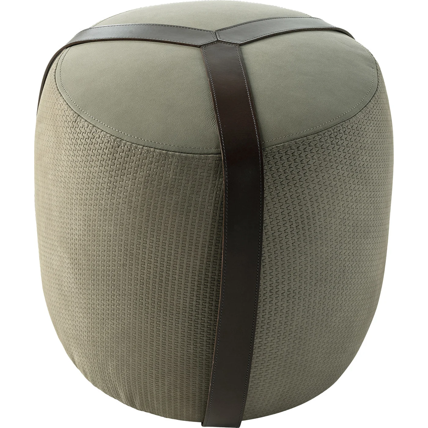 The Brooklyn pouf exudes eclectic elegance with its meticulous sartorial details and decorative leather belts. Ideal for both home and public spaces, it can be used individually or arranged in custom groupings. The seat is upholstered in Dark Dove Nabuk leather, while the sides are covered in Grey Relief Nabuk leather. Dark brown saddle leather belts with decorative cotton stitching complete the look. A stylish accent that adds sophistication to any interior decor.