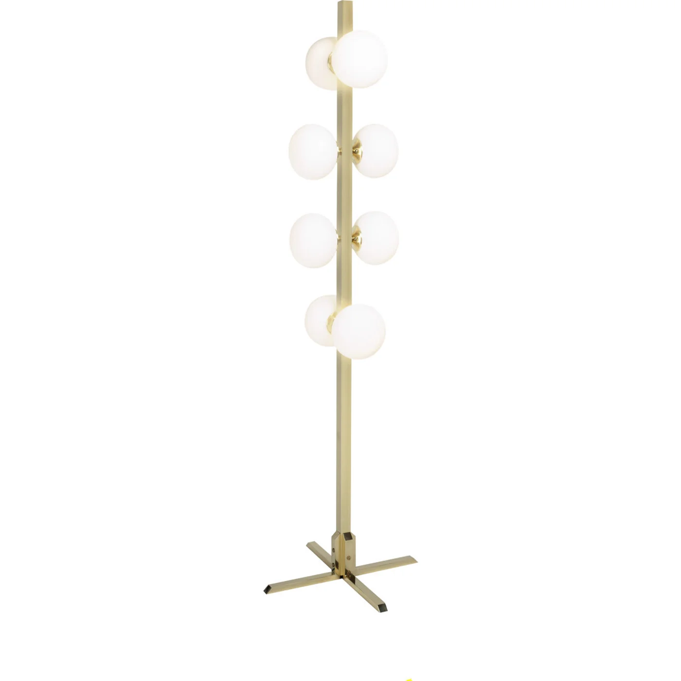 Bringing vibrancy and brightness to any modern living room, this floor lamp features eight white opaque glass spheres arranged in an alternating line along a sleek brass stand. Entirely handcrafted with traditional techniques and premium materials, it is a versatile piece that doubles as both a source of light and a striking decorative statement.