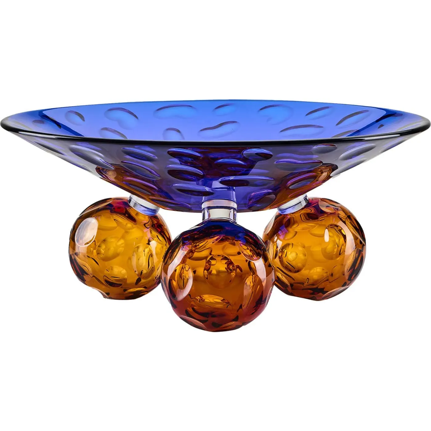 The Bubbles Suspended Centerpiece is akin to a vase in midair, crafted with a focus on balance and suspension. This concept imparts an aura of lightness and grace to the object. It captures the essence of movement within stillness, characterized by the fluidity of its engraving and the profound azure hue.