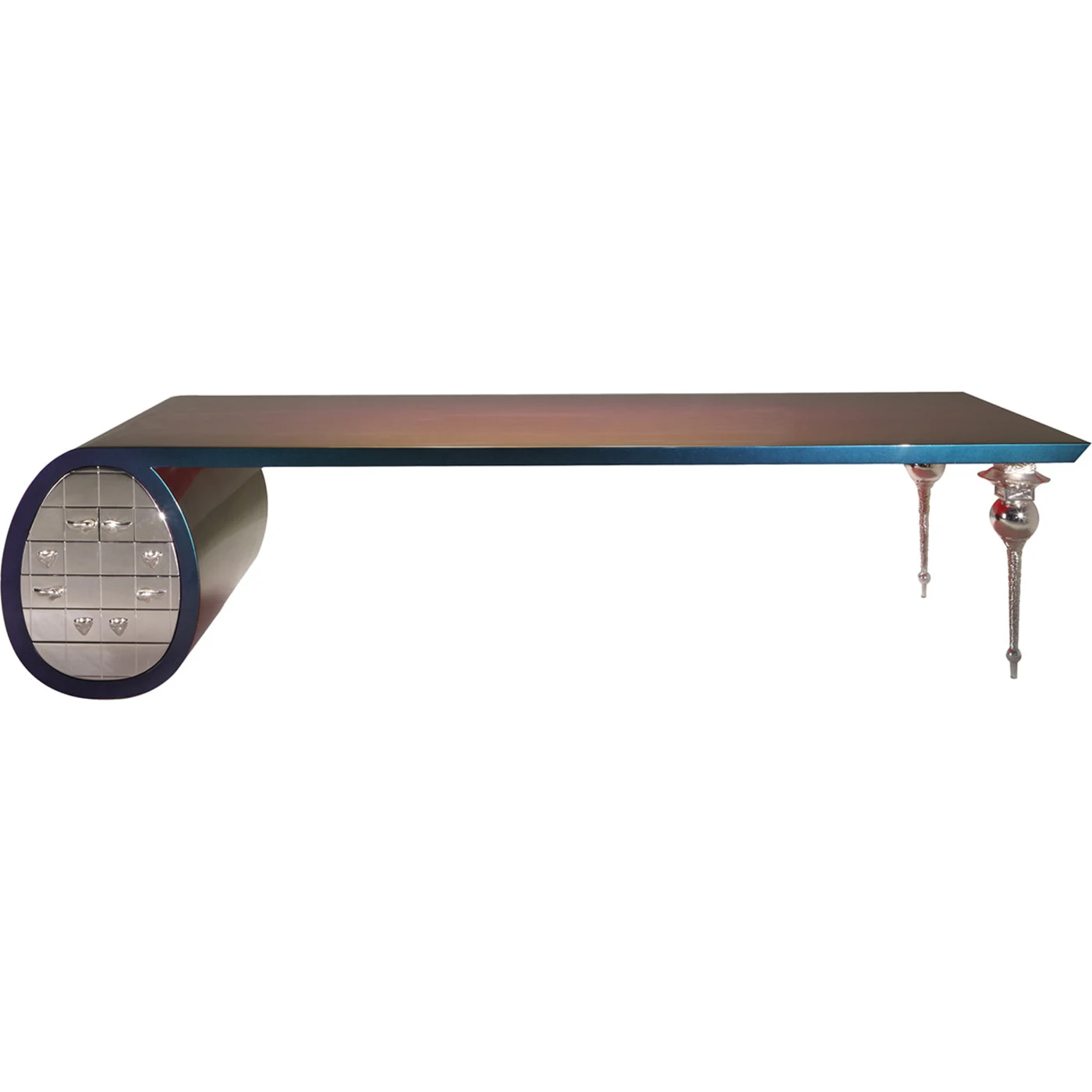 The solid wood top of the Caos Maxi Chameleon Writing Desk has an iridescent finish that displays a captivating combination of pink and gold hues. Its construction is supported by two cast bronze legs as well as an oval unit with multiple useful drawers that has an opulent silver leaf finish.