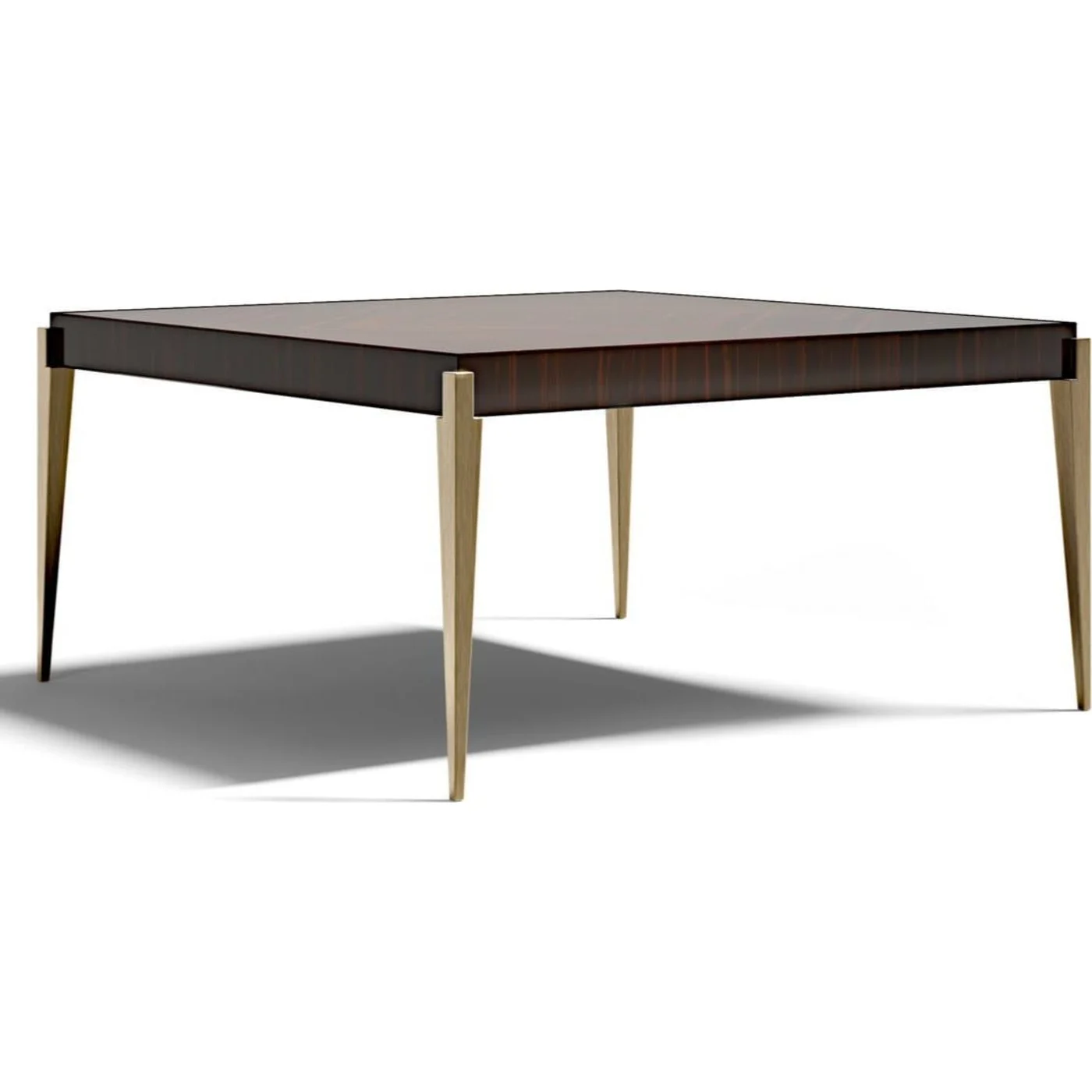 Carisma Q showcases a square wooden table featuring sleek metal legs for a contemporary touch. Its top is crafted from quality essence, adding warmth and natural beauty to its design.