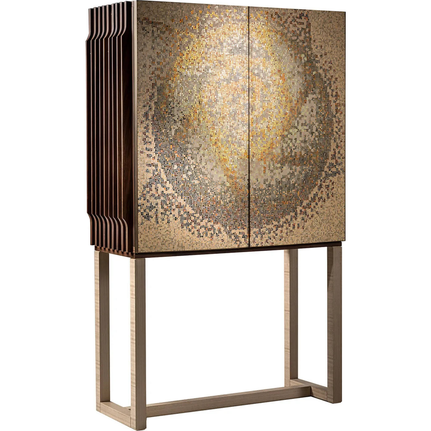 The sculptural allure of this bar cabinet elevates any modern interior with unparalleled sophistication. Its unique design, blending solids and voids, draws the eye to the mesmerizing doors crafted from eucalyptus wood adorned with highly reflective glass mosaic tiles. Flanking vertical elements in Canaletto walnut, alternating with layers of glass and thin metal mesh finished in bronze, embrace the storage unit, creating a captivating visual contrast. This combination of materials and textures adds a touch of elegance and refinement to any space.