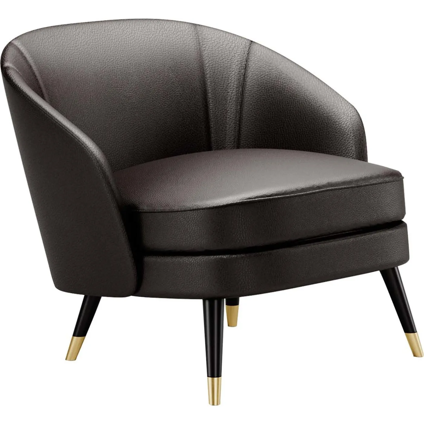 Smooth and elegant lines define this sophisticated armchair, which features a wooden frame padded with different-density foam and wholly covered with prized leather. The curved backrest results particularly embracing, together with the plush seat's cushion. The whole structure stands on four oblique, lacquered feet accented with luminous golden metal ferrules.