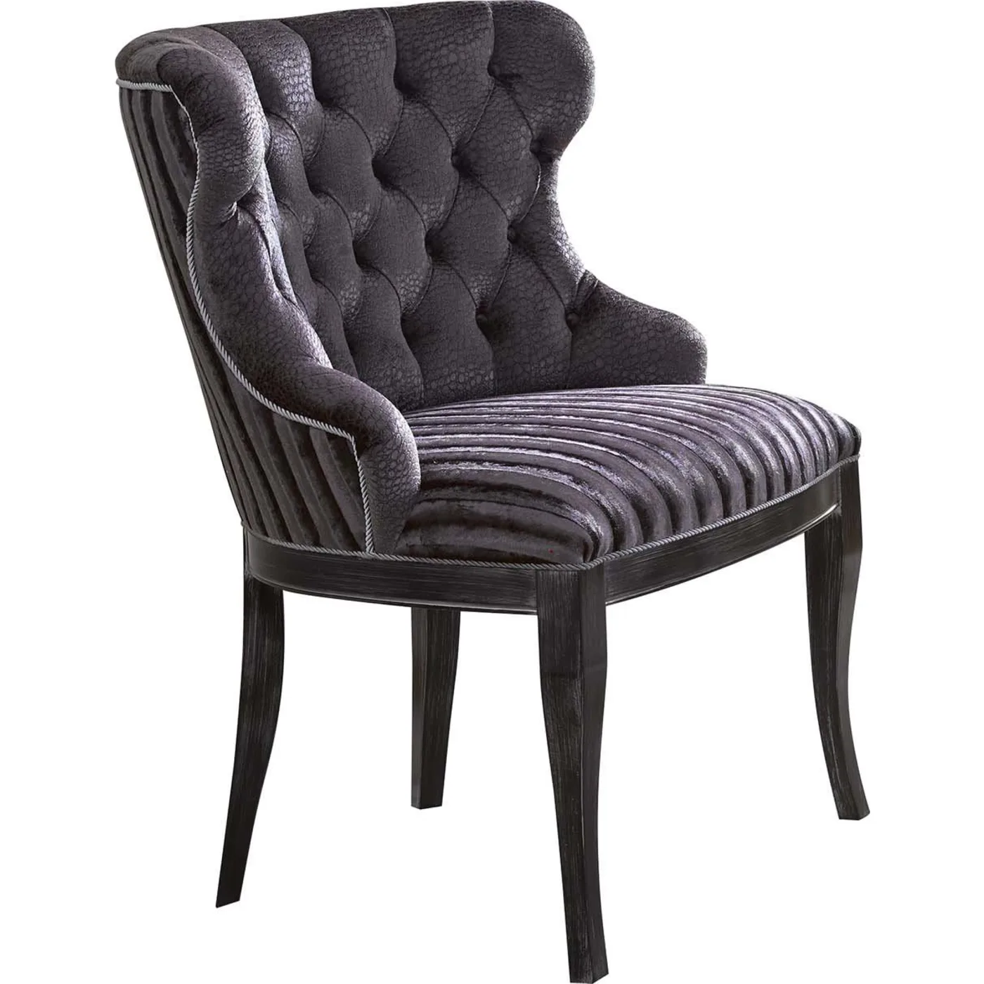 The cosy Century armchair showcases gunmetal-grey striped fabric on its seat and exterior, accompanied by a solid-coloured, dappled gunmetal grey back. Its tufted back adds a touch of classic sophistication, fitting seamlessly in any setting. Black legs with a silver patina finish complete the style. Handcrafted in Italy, this piece exudes comfort and elegance.