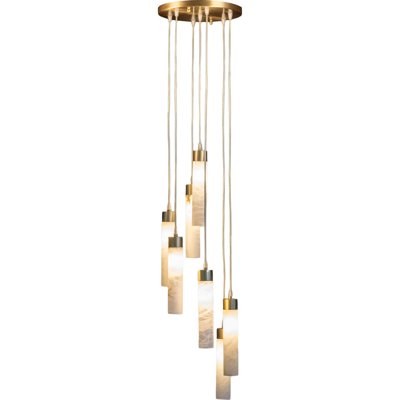 This Refined light fixture features a composition of seven natural alabaster stone tubes paired with metal accents in a light antique brass finish. Its minimalist design seamlessly complements both classic and modern interiors adding an air of elegance and timeless charm to any space.