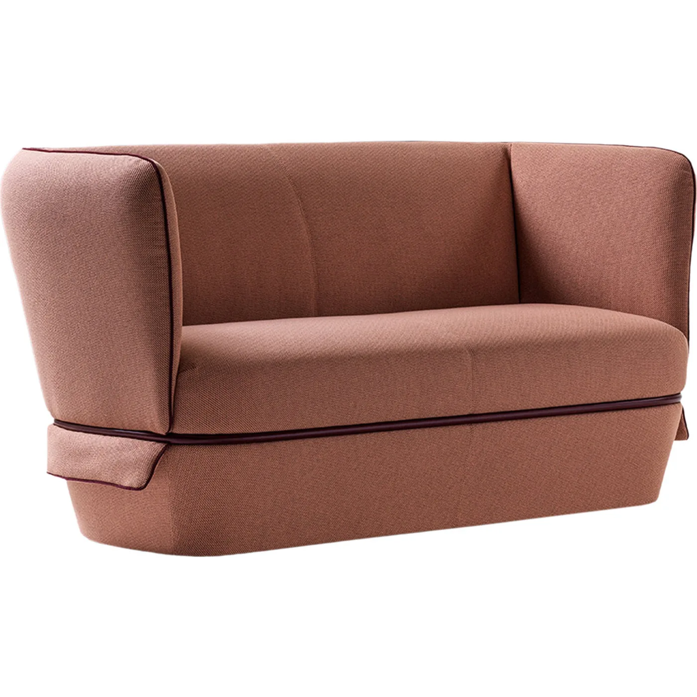 With its sturdy oak frame, multi-density polyurethane rubber padding, polyester fiber lining, and delicate apricot-pink fabric upholstery, this opulent sofa is as dignified as it is colorful. A blood red lacquered metal ring on the base of the plush seat heighted 45 cm is accentuated by burgundy piping that follows the soaring features of the armrests and backrest which is 78 cm high (RAL 3004). Color change is available on request. For more information please contact the Concierge.