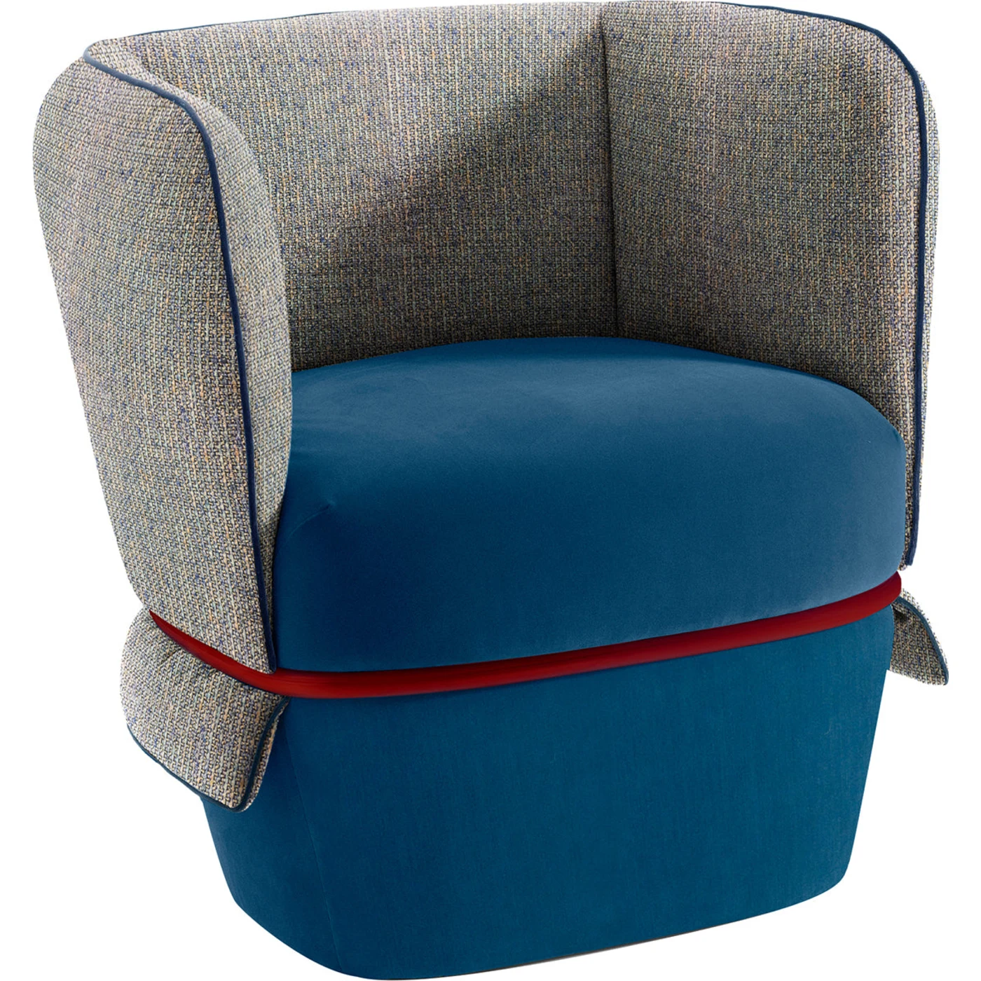 With a modern interior, this vibrant, diverse design by Studio LI_DO will stand out. The piece has a sturdy base with a tall, hugging backrest, is softly padded with polyester fiber and polyurethane foam, and has a wood frame kept together by a red-lacquered steel ring. The back is covered in a gray-and-blue embroidered cloth, while the seat is upholstered in blue velvet.