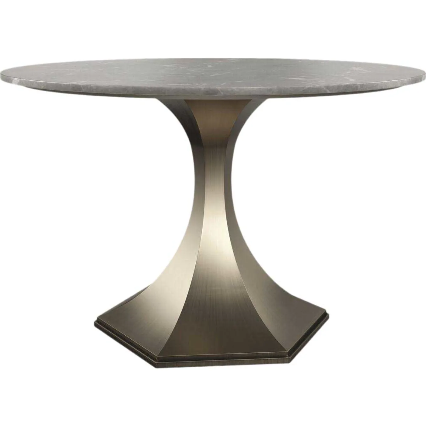 Perfectly sized for an entryway, library or smaller dining area this 48” (122 cm) pedestal table makes a stylish statement. It features a luxurious yet durable grey sintered stone top, mimicking the classic elegance of veined marble. This top rests gracefully on a cinched fluted base finished in Brushed Antique Brass. When used as a dining table, it comfortably accommodates up to six seats.