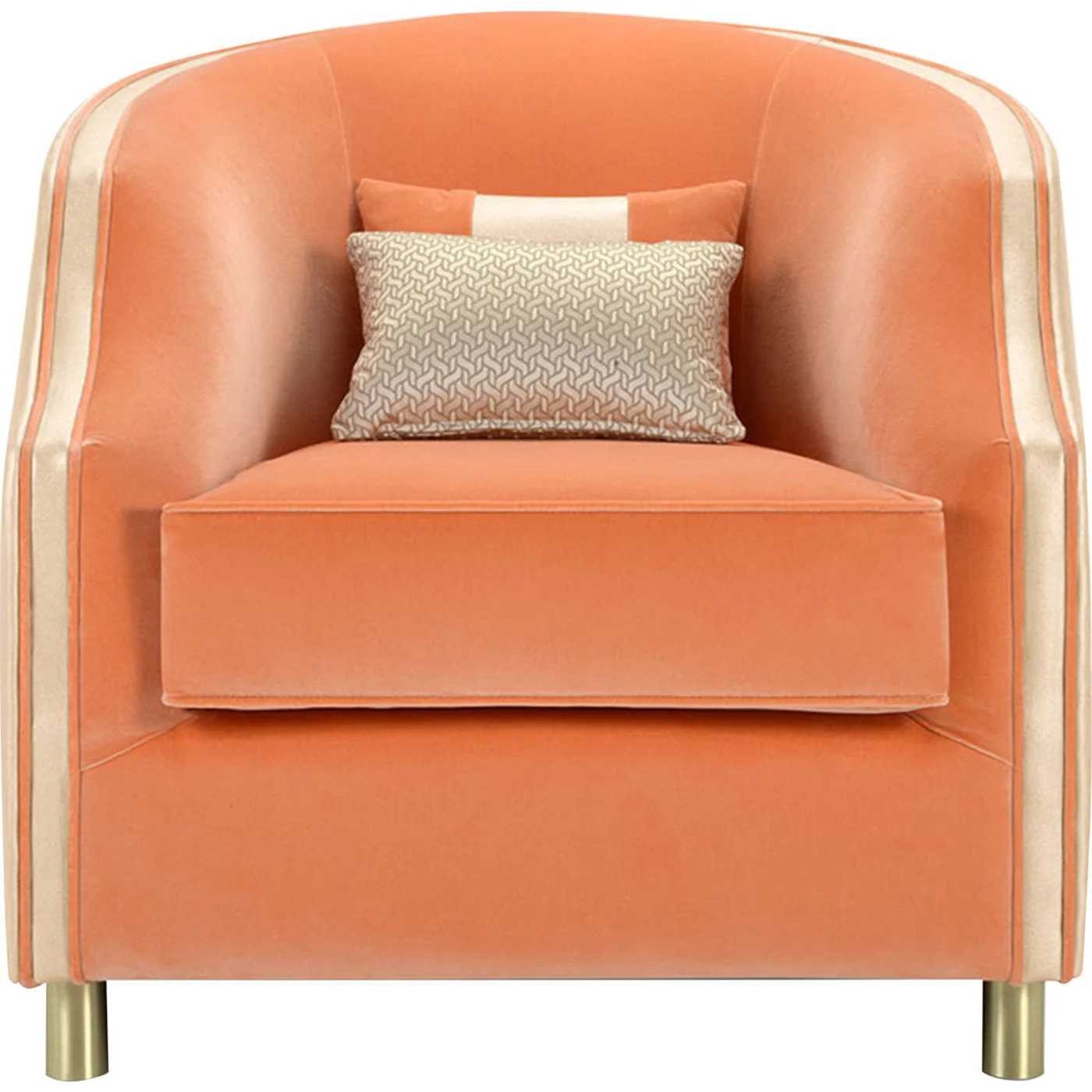 Inspired by Cleio one of the nine muses of Greek mythology, this elegant collection features a vibrant, handcrafted armchair, also available as a bed upon request. It provides a cozy retreat where sartorial elegance meets ultimate comfort. The design boasts a curved backrest with a smooth, shell-like finish, and the entire structure is generously padded and upholstered in rich, orange velvet. An additional decorative cushion is included with your purchase.