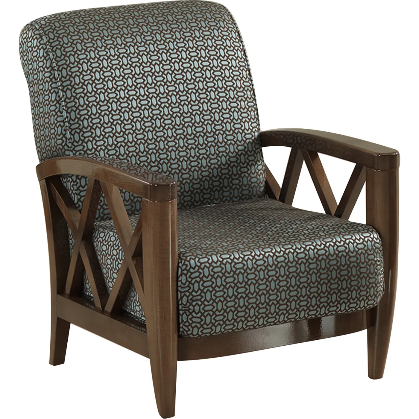 An exquisite addition to the refined Studio Interiors Collection, this armchair seamlessly blends aesthetic appeal, comfort, and functionality. Handcrafted from glossy walnut-finished wood, it features distinguished geometric detailing on the armrests. The padded seat and backrest are upholstered with first-rate patterned fabric, adding a touch of luxury. For more details, please consult the Concierge.