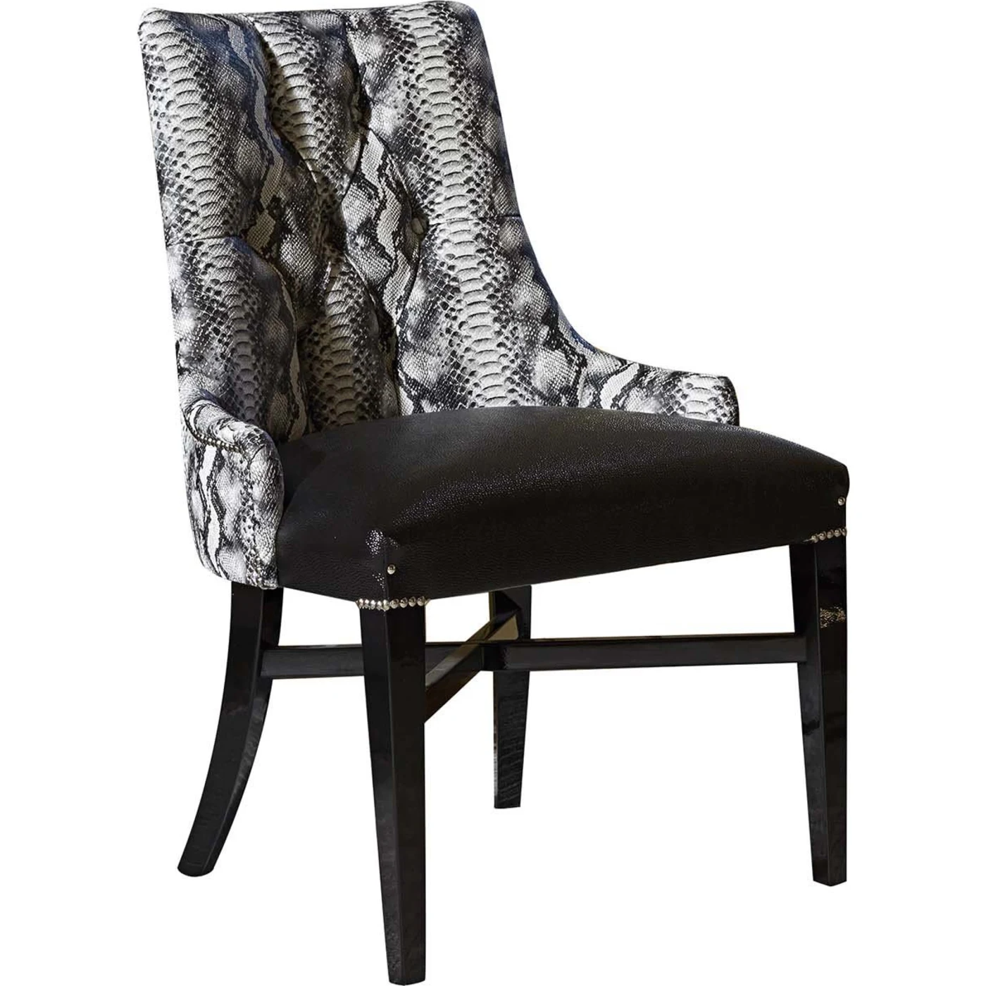 This armchair brings together a modern city look with a touch of safari-inspired charm. The back of the chair has a white-and-grey texture that resembles crocodile skin, adding an interesting visual element to the black faux-leather seat. The chair stands on four legs that are shiny black in colour. This chair is crafted by hand in Italy's Veneto region, famous globally for its rich heritage in crafting exquisite furniture.