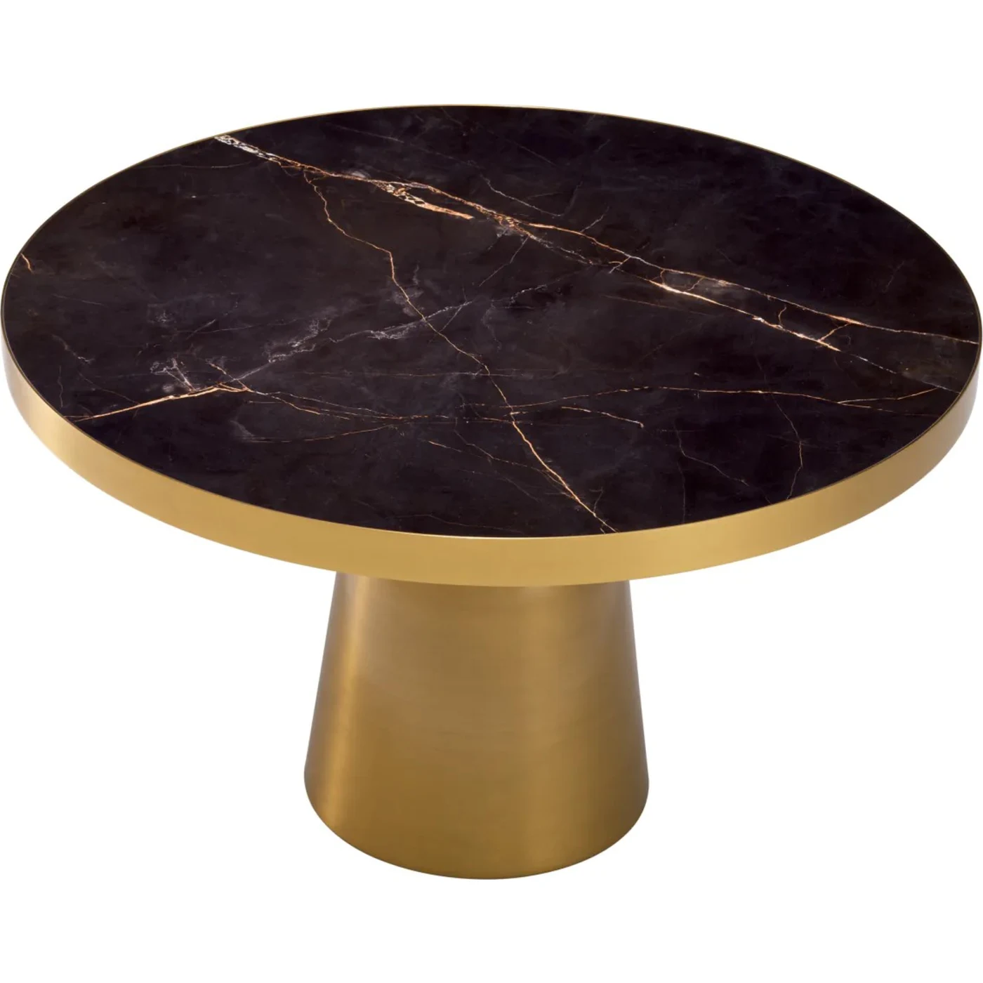 The Soren Coffee Table exudes eclectic style with its elegant design, blending a contemporary aesthetic with a modern touch. The brushed brass frame supports a round tabletop featuring a black ceramic marble look, complete with a chic brushed brass rim.