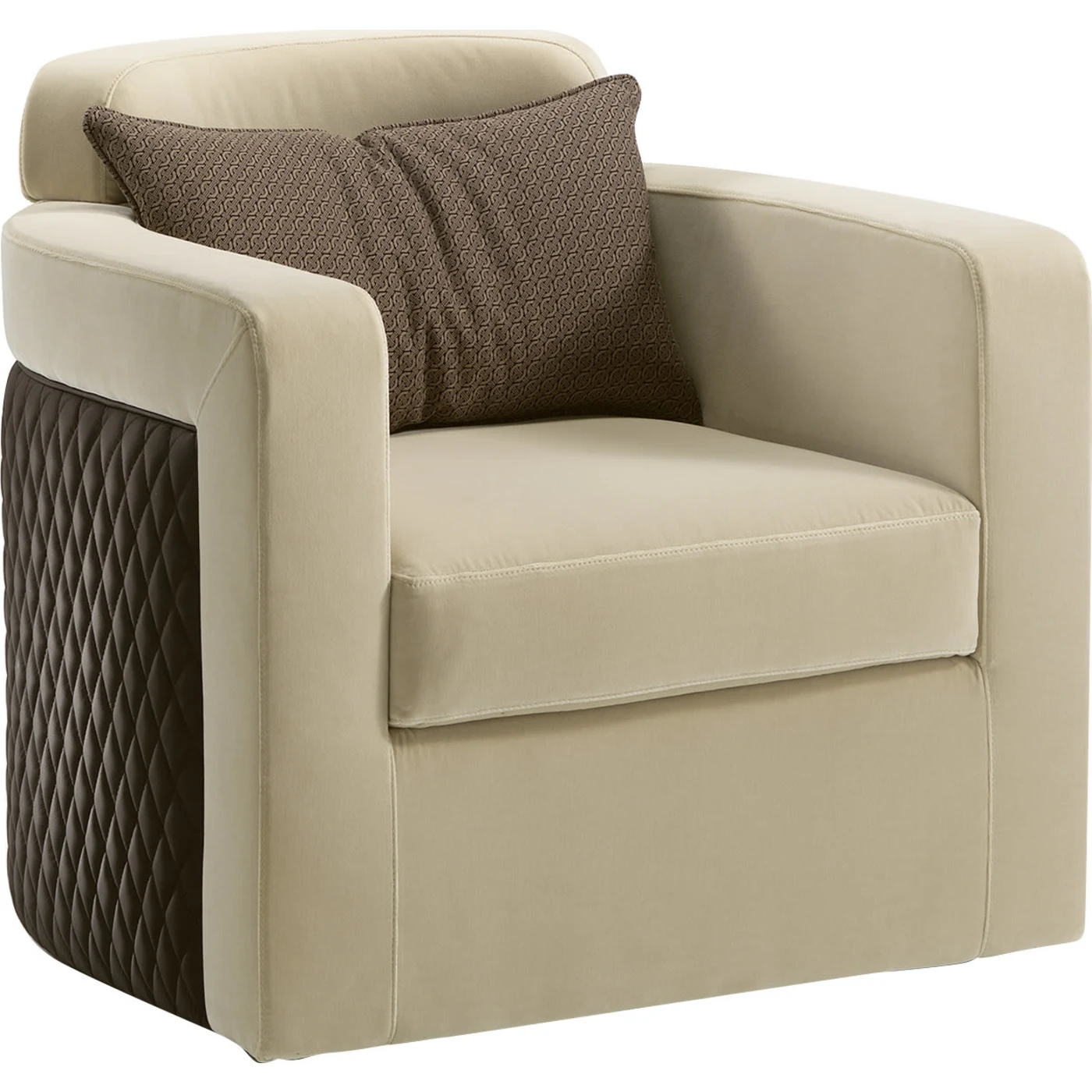 Meticulously crafted with sartorial precision, this armchair seamlessly merges aesthetic appeal with functionality, boasting an ergonomic and elegant silhouette. A standout piece from the Studio Interiors Collection, it is equipped with a 360-degree swivel base, enhancing the quality of its handmade design. Constructed with a solid wood frame and soft polyurethane padding, it is upholstered in a sophisticated combination of velvet and quilted leather, adding a touch of luxury to any space. For more details, please contact the Concierge.