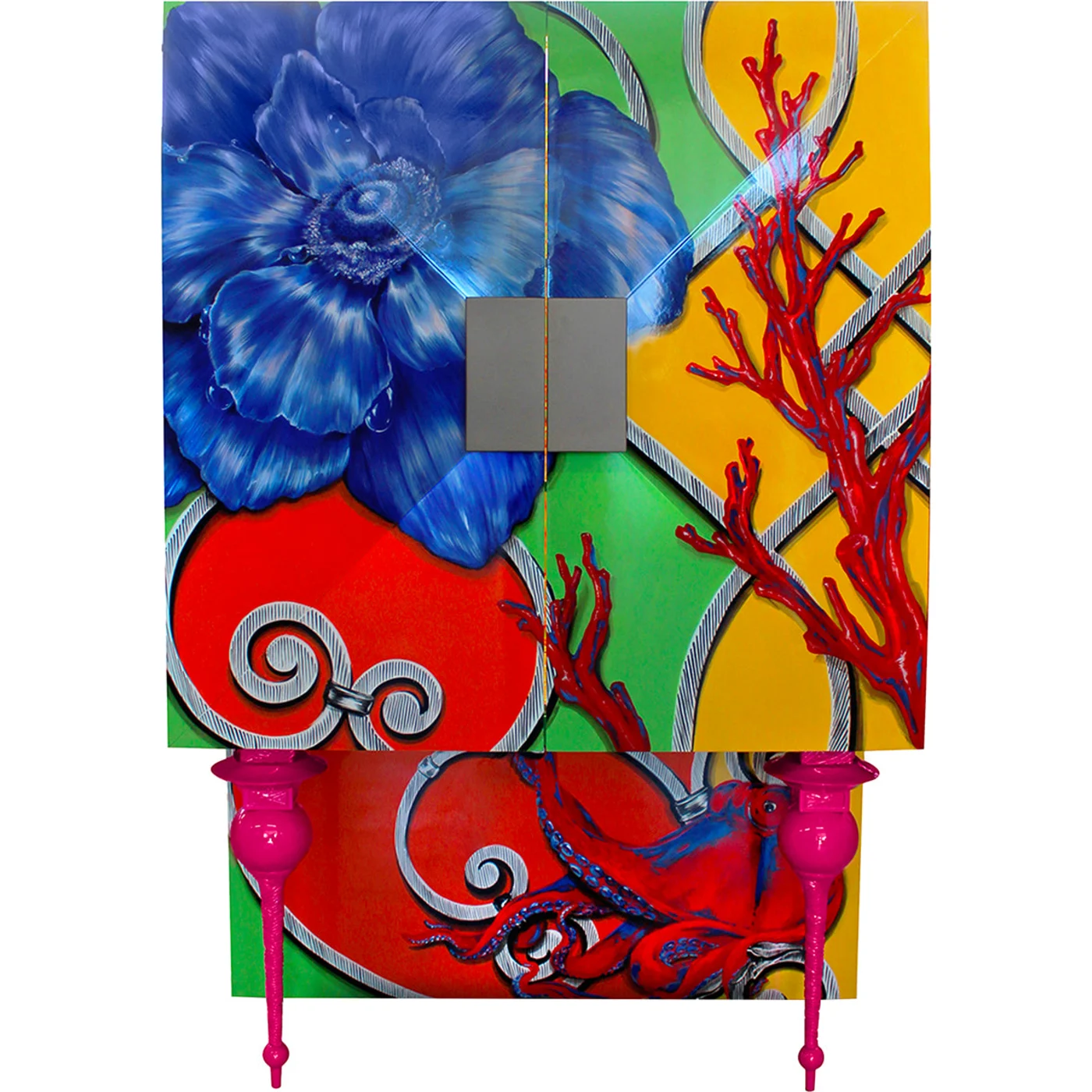 The Costantino Bar Cabinet, a famous signature piece by Carlo Rampazzi, is a remarkable fusion of art and design. It is made of wood, painted by hand in a variety of vibrant colors, and opens up to a hand-carved interior that is adorned with Crazy Glass, which is evocative of Venetian murrine. The legs, which are also offered in a natural tone, are finished in a pink lacquered tint and are crafted from bronze using the lost-wax technique. For more information, please get in touch with the Concierge.