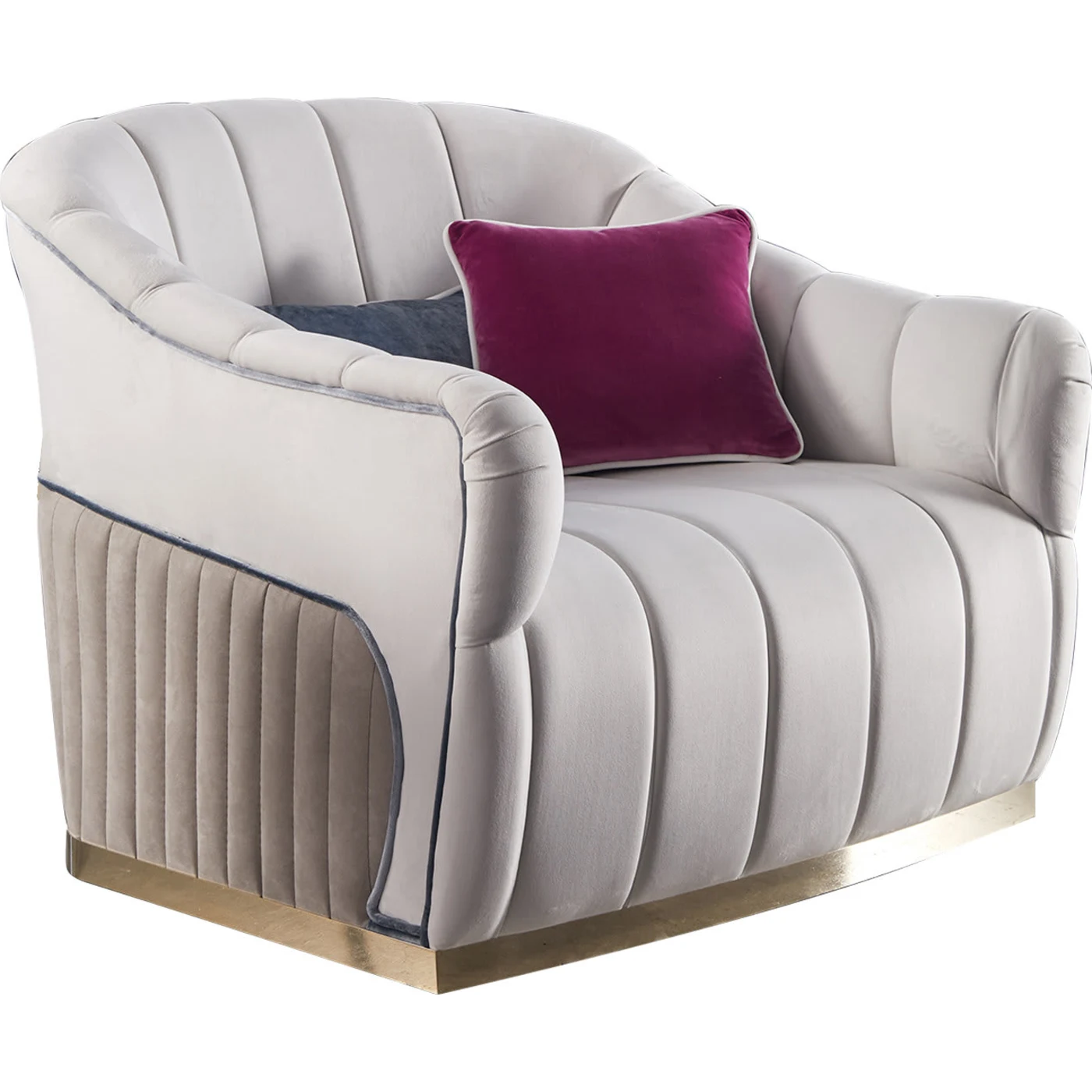With a stylish lounge vibe, the Crystal Armchair is carefully made in Italy's Veneto region. It's perfect for modern living rooms, sitting on a golden metal base and covered in cool, sandy-coloured faux leather. The armchair is cosy with its elegant ivory fabric and comes with extra decorative cushions, adding both charm and comfort.