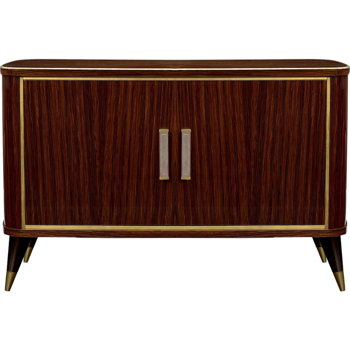 This sideboard embodies modern charm and timeless elegance; it is the perfect choice. Its gracefully curved silhouette balances the rich ebony finish that covers the entire wooden frame. The design features metal accents around the vertical handles of the two doors, at the tapered feet's ends, and in a luminous frame outlining the front side of the storage unit.