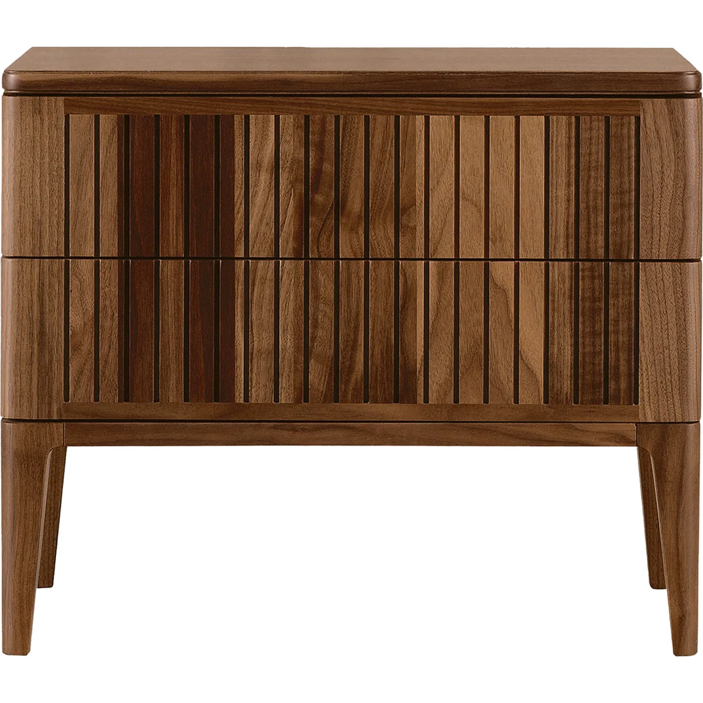 The Eleva solid wood bedside tables merge refined Italian design with expert craftsmanship. The front doors, crafted from premium solid walnut with an acrylic finish, feature a linear style that creates a captivating interplay of light and shadow.