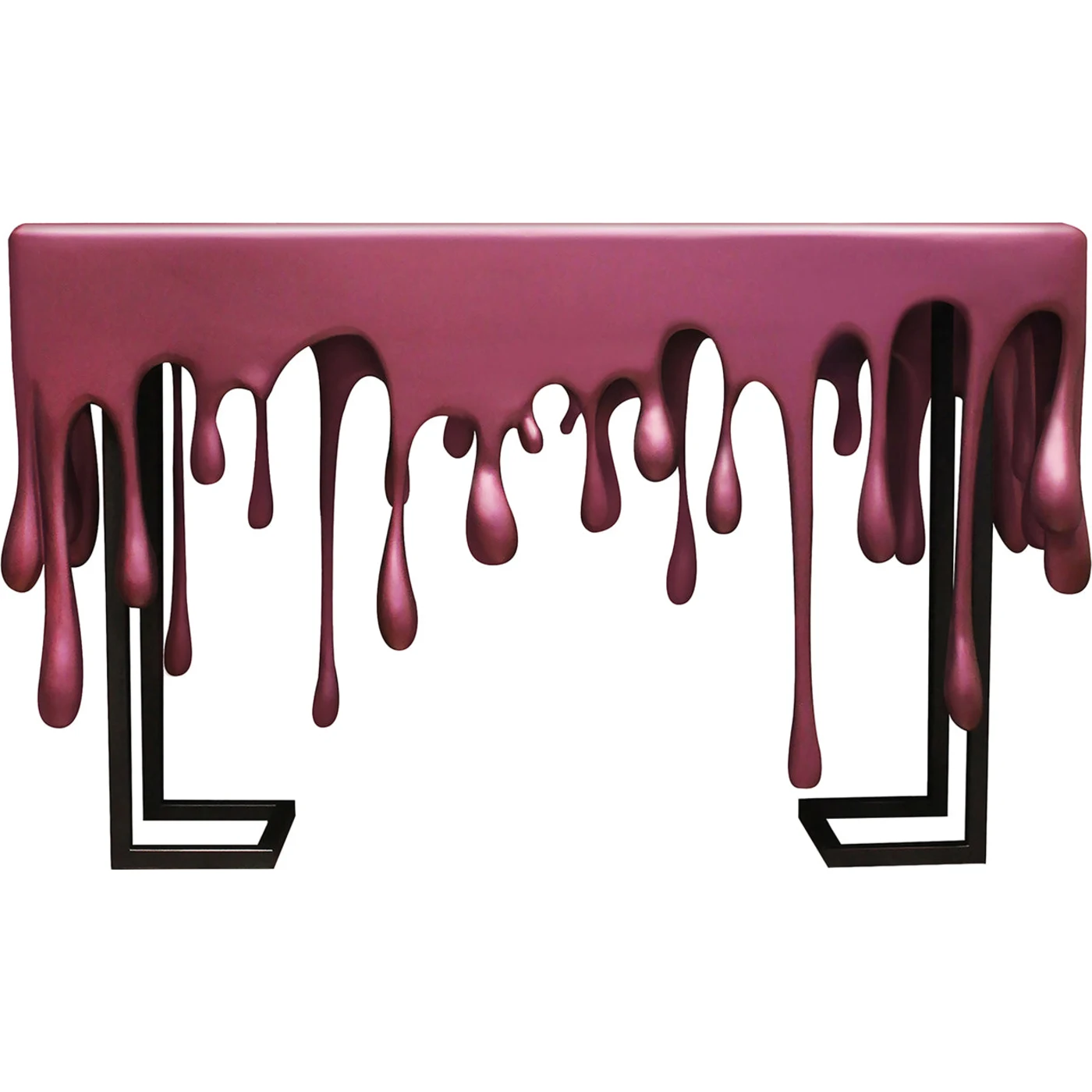 Carlo Rampazzi's console table with iron and wood carvings. The shelf and drops have an iridescent burgundy lacquer finish, while the pedestal is finished in matt black lacquer.