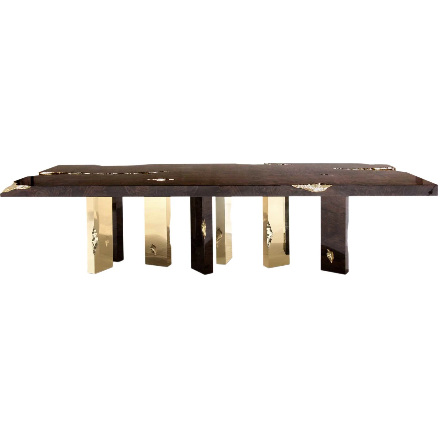 - • The Empire dining table’s surface is made in mahogany, coated in a fine wood veneer, with high polished brass details to fill the cracks. Its legs, also made from mahogany are finished the same way, and with polished brass sheets