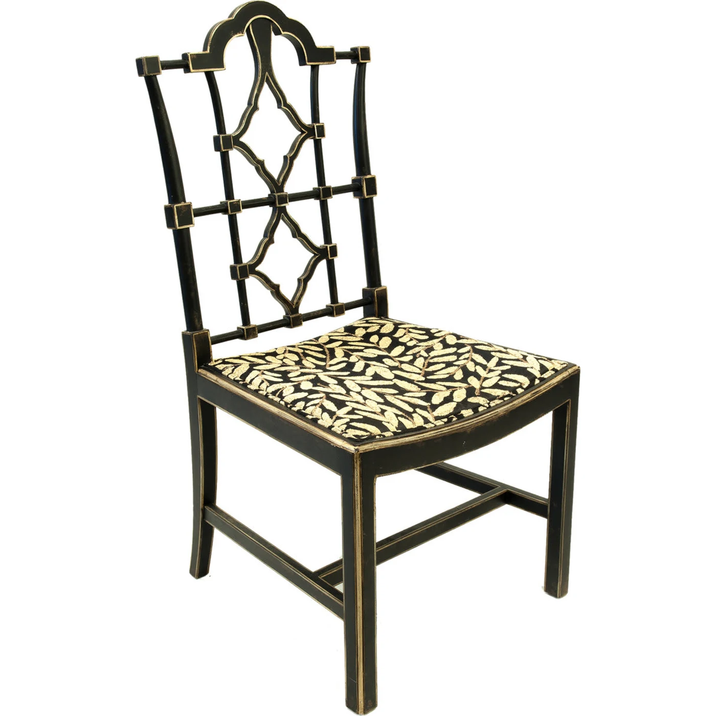 This chair has the elegant charm of 18th-century Venetian style. It combines classic beauty with skilled craftsmanship. Painted in aged black, it has an open back with a delicate geometric design, a shaped seat, and an H-shaped base. The elegant black fabric upholstery with gold branches adds a touch of luxury. It's great for dining or as a standout piece. For customization, please contact our concierge service.