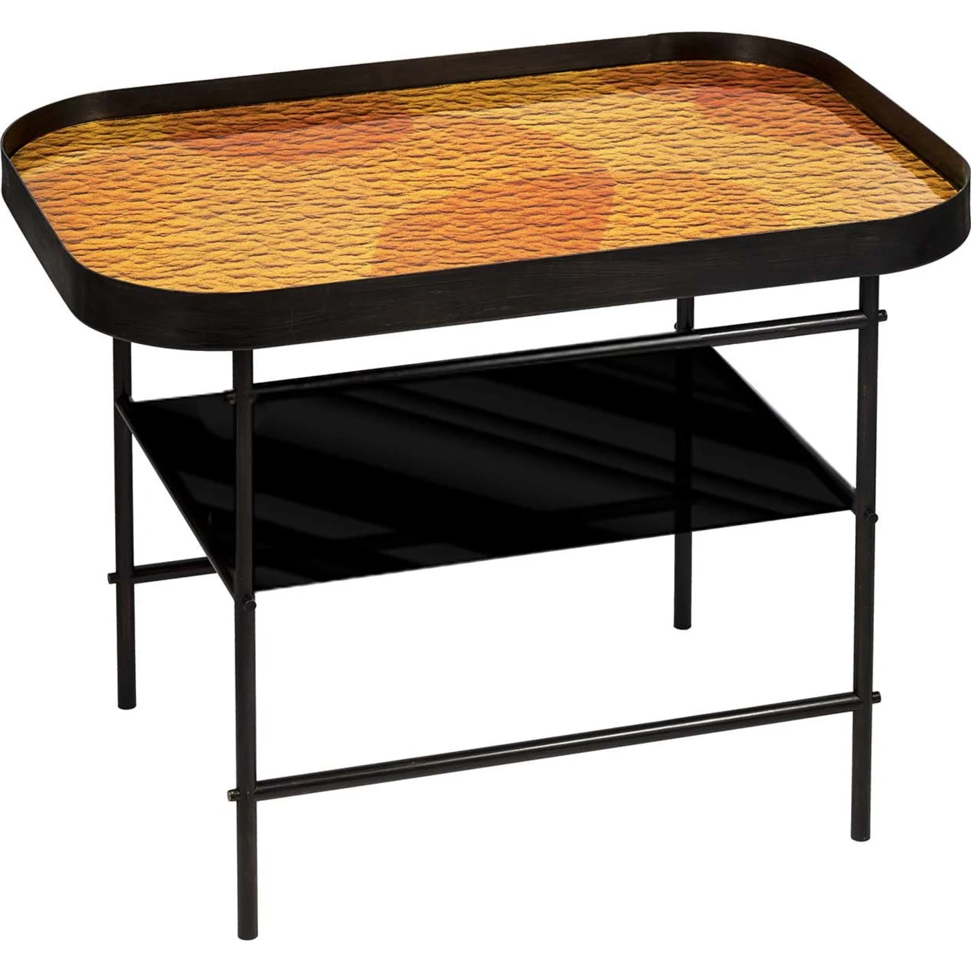 This stylish piece of functional decor brings sophistication to any modern dining or living room. It features two practical surfaces ideal for displaying everyday items, food, drinks, and collectibles. The table's linear brass frame, finished in black wax, supports a bottom shelf of black glass and a top shelf that doubles as an extractable tray. The top shelf has elegant rounded corners and a base of yellow glass adorned with abstract patterns. Additionally, this side table is available in blue.