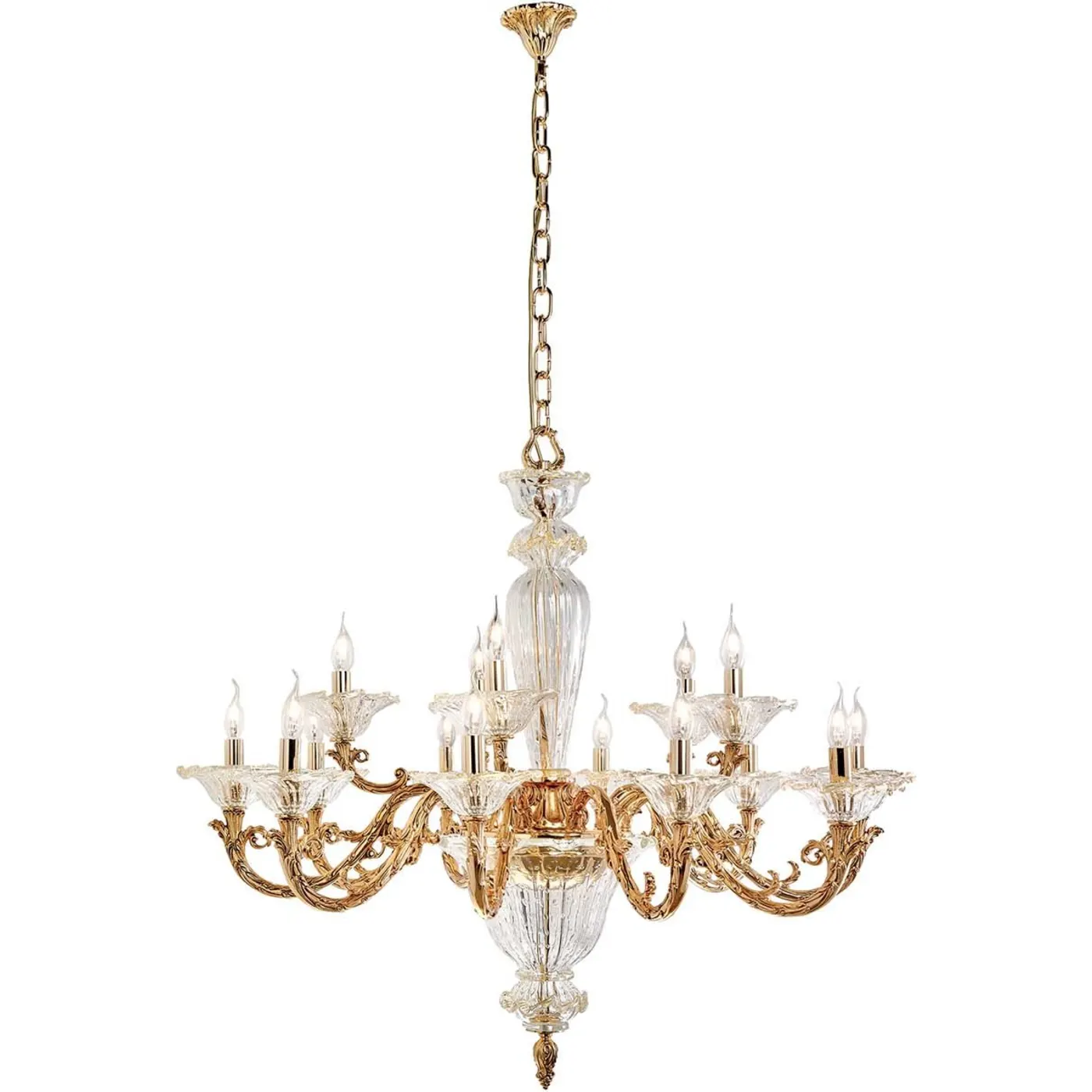 This Refined gold-plated chandelier features sinuous arms that flourish with graceful, flower-shaped bobeches, showcasing masterful craftsmanship. Clear glass accents, adorned with a delicate ridged design, enhance the central stem, lower bowl, and finial, evoking the timeless elegance of a lily. Romantic and refined, this exquisite piece makes a striking addition to a traditional dining room or a spacious living area, especially when complemented by cream-colored seating. It provides illumination through 15 E14 bulbs, each with a maximum power of 42W.