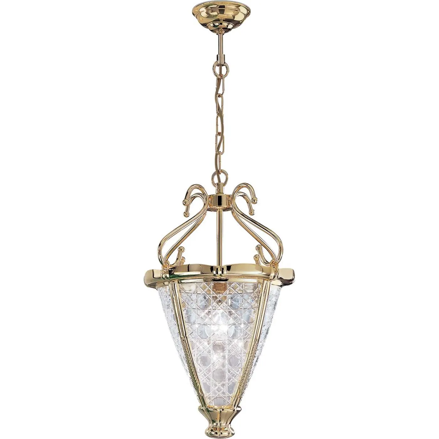 This stunning suspension light effortlessly combines old-world charm with contemporary design, featuring a sculptural profile inspired by classic lanterns. The polished gold-finished frame boasts a top with scalloped edges, Stylishly suspended from a central stem accented by four S-shaped supports. A conical shade crafted from cut crystal panels with a double-crossed pattern completes the vintage-inspired design. Perfect for entrances and hallways, this light fixture provides beautifully diffused illumination. It accommodates a single E27 lightbulb with a maximum power of 42W, blending timeless elegance with functional style.