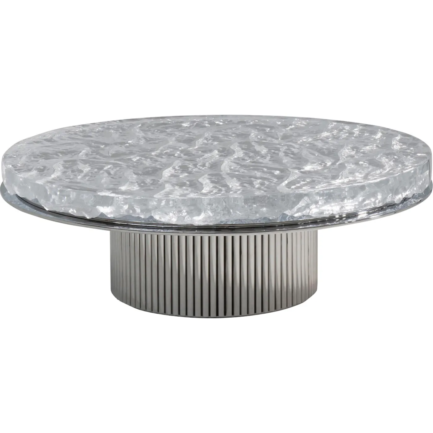 Hessentia has enjoyed a longstanding collaboration with the skilled glass artisans of Venice, culminating in the Miller collection of coffee tables. These artisans have inherited and refined the ancient Murano glassmaking techniques across generations. The glass top of the table represents an innovative twist on tradition, pushing the boundaries with its unconventional design. Crafting a large, thick glass top through casting posed significant production challenges, adding to the table's uniqueness. A metal plate supports the top, enhancing reflections akin to sea ripples from the glass's underside. The cylindrical base comprises numerous interconnected thin metal rods, completing the distinctive design of the Miller collection.