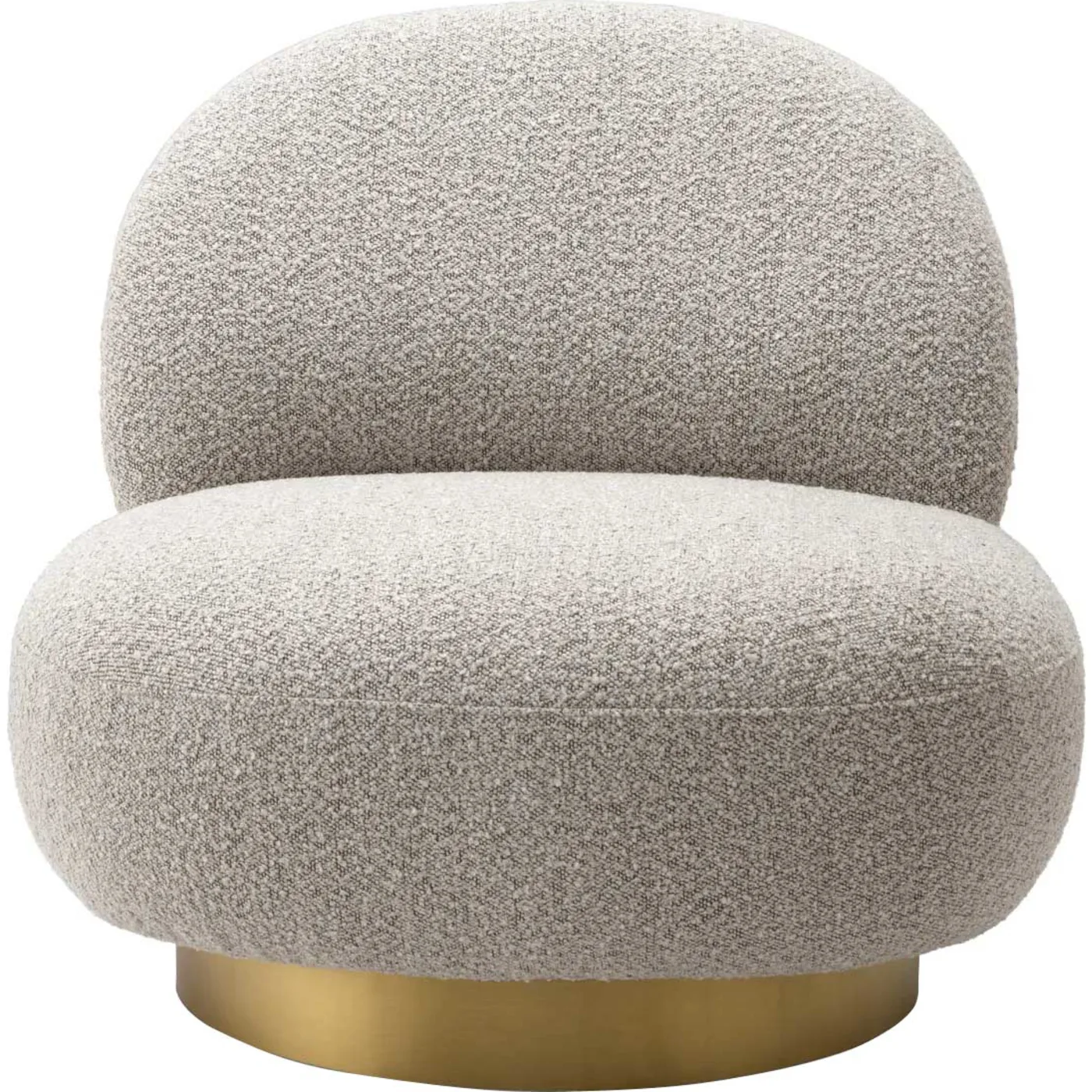 Resting atop a brushed brass base, the Clément Swivel Chair exudes laid-back luxury. Upholstered entirely in grey-colored bouclé, this well-rounded accent piece seamlessly integrates into any interior space.