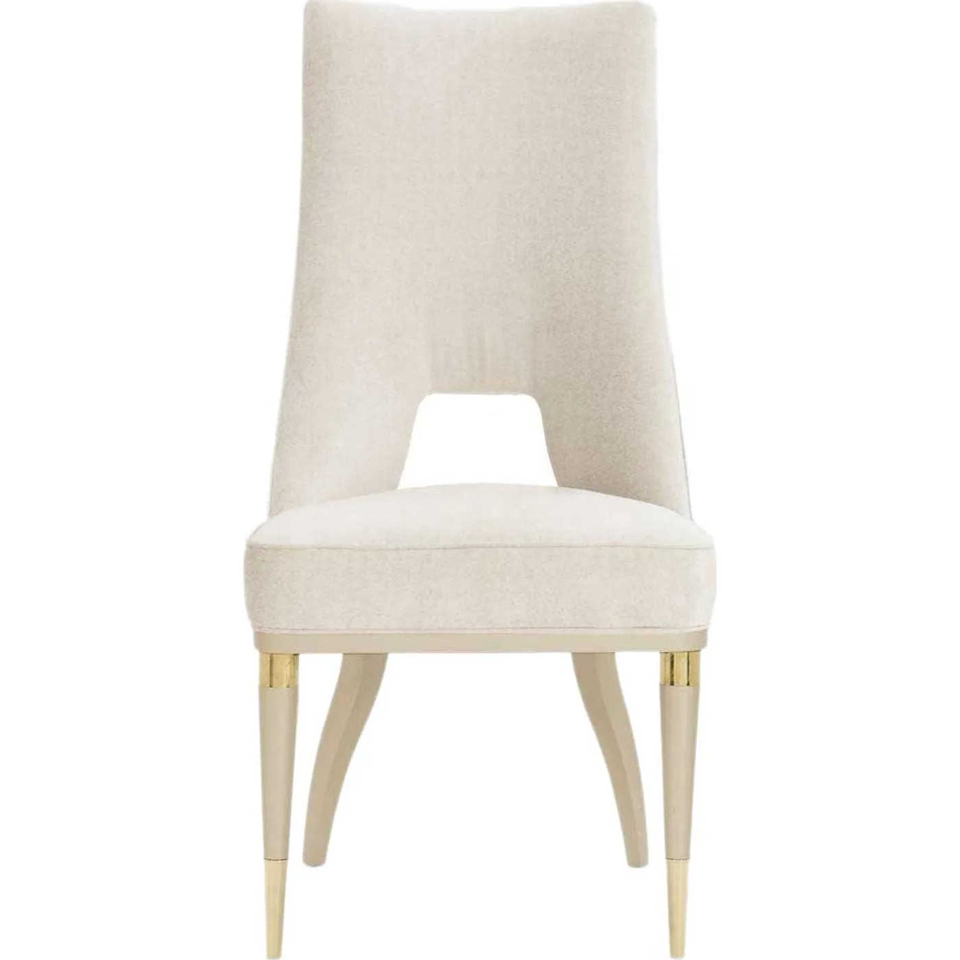 Every guest will feel like the Guest of Honor when they're invited to dine and relax in the comfort of this fabulous, upholstered dining chair. Its tall, contemporary back is impeccably tailored in a luxurious neutral fabric and boasts a lower peek-through opening that adds instant drama. A shimmering Soft Radiance finish accentuates its two unique leg styles, lending a touch of sparkle that beautifully reflects candlelight or an overhead chandelier. Like bold jewellery, metal collars and ferrules plated in Whisper of Gold adorn each front leg, completing the ensemble with sophistication.