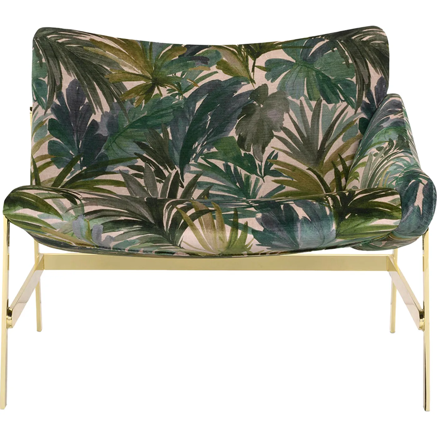 Designed for the Hammock series this armchair is perfect for luxurious homes with its elegant style and gentle curves. Featuring a single sloped armrest, the chair rests on a dynamic metal base with a gleaming golden finish that complements the warm earthy tones of the tropical motif on the viscose fabric upholstery. The seat height is 40cm, ensuring comfort and sophistication.