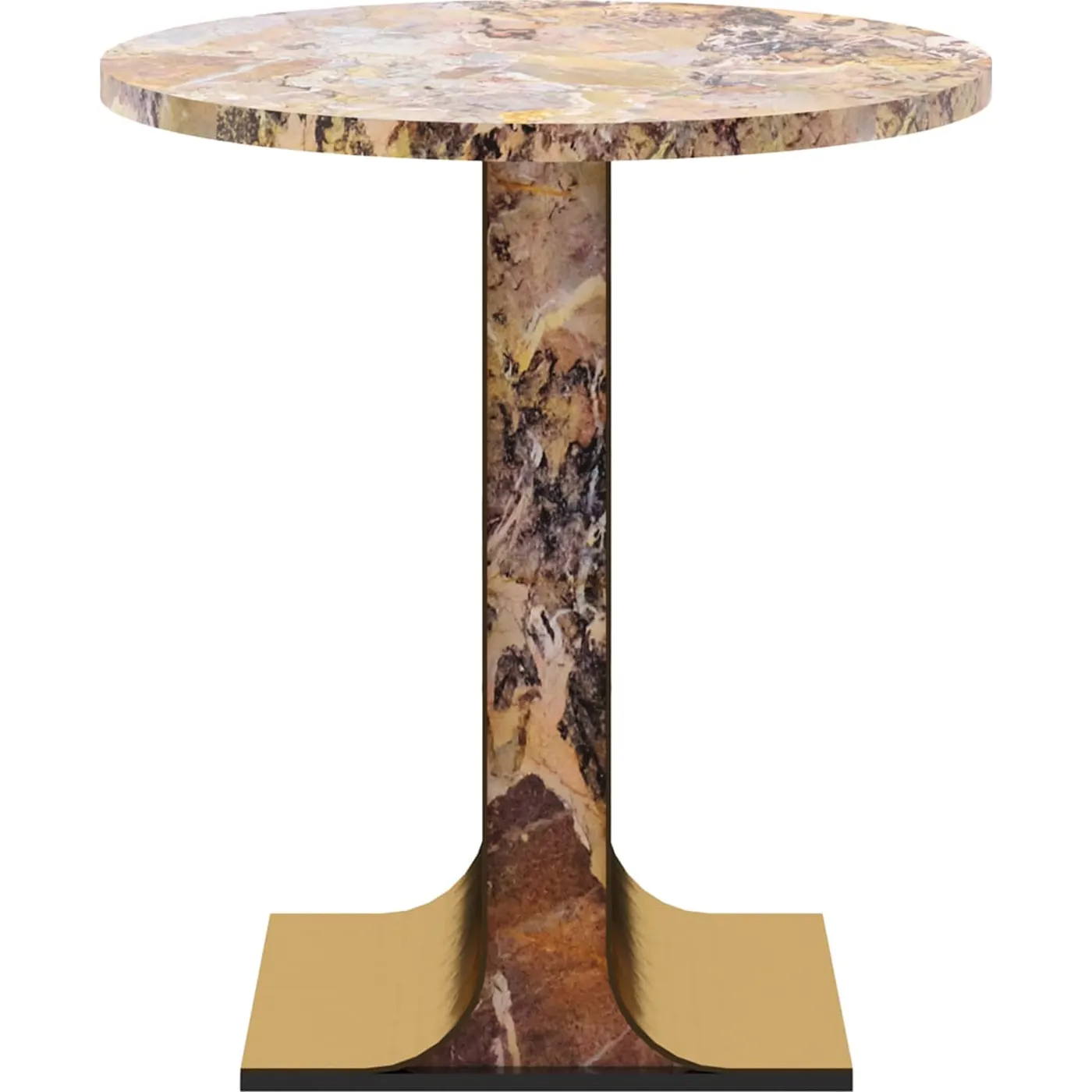 Defined by simple yet elegant lines, this side table brings a sculptural modern presence to any space. The round Opera Fantastico marble top rests on a central metal leg, composed of two bent sheets joined by marble inlays on the front and back. Finished in glossy bronze, the structure enhances the bold contrast between metal and stone, highlighting the table’s refined craftsmanship. Fully customizable and available in a variety of marble and metal finishes. For more information, please contact the Concierge. Natural variations in the marble ensure each piece is unique.