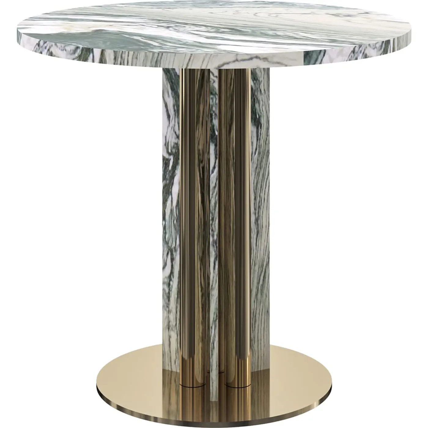 This side table embodies simplicity and elegance through its clean, essential lines. The Cipollino Verde marble top is supported by a central leg composed of a round base and four glossy gold-finished metal tubes arranged in a circle. From these, three slender Cipollino Verde marble slabs rise upward, creating a refined balance of structure and sculpture. Fully customizable and available in a variety of marble and metal finishes. For more information, please contact the Concierge. Natural variations in the stone ensure that each piece is unique.