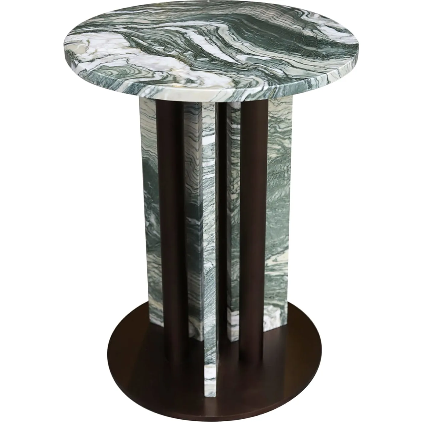 The Haru side table designed by Paolo Ciacci embodies refined simplicity through its clean, architectural lines. A Cipollino Verde marble top rests on a central leg composed of a round base and three bronze shadow–finished metal tubes arranged in a circular formation. From these, three slender Cipollino Verde marble slabs rise gracefully, blending structural integrity with sculptural elegance. The result is a minimalist yet striking design that highlights the natural beauty of the stone. Available in a variety of marble and metal finishes, the Haru table is fully customizable. For more information, please contact the Concierge.